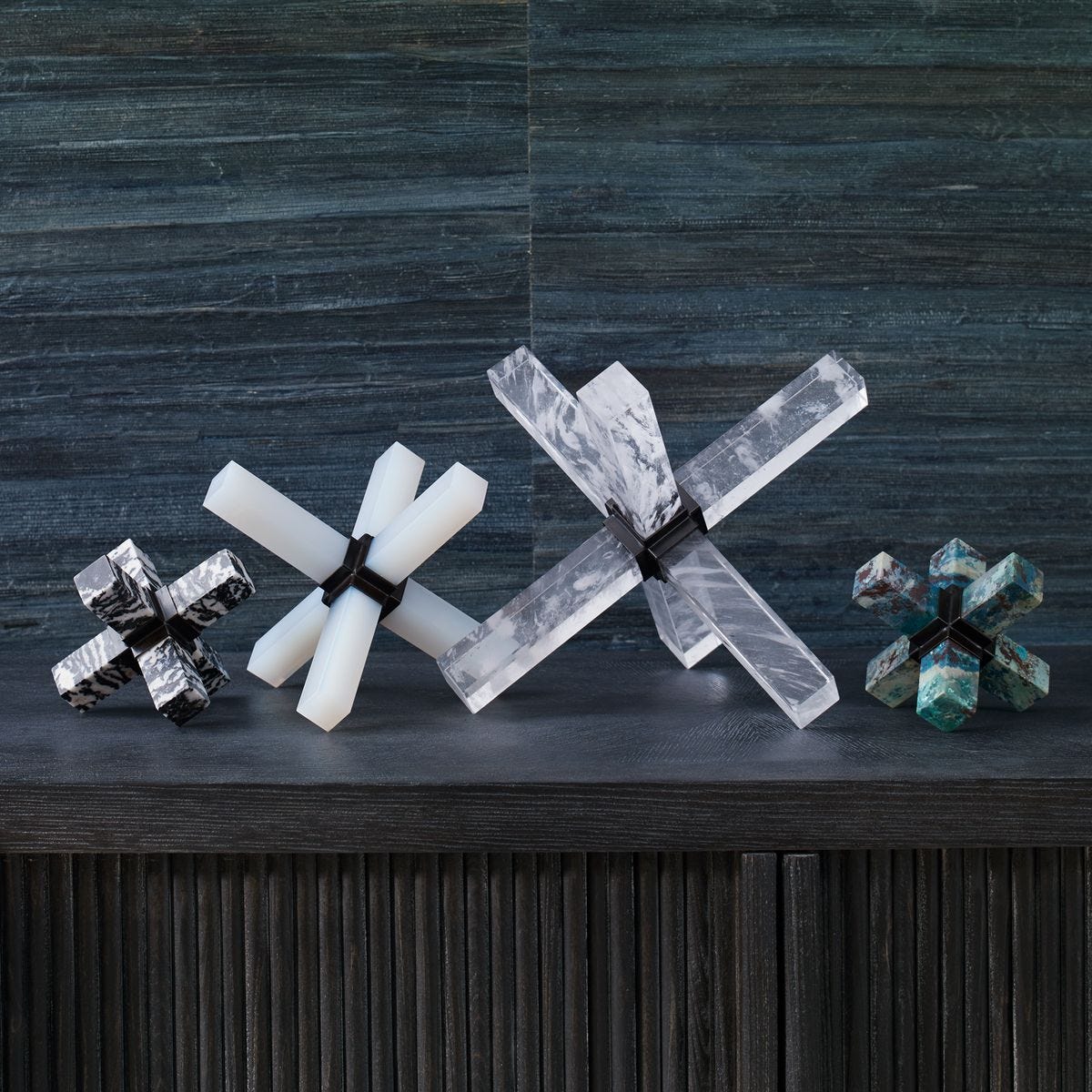A reimagined version of the classic game of jacks, the Double Cross sculptures are a fun yet sophisticated accent to your shelves or tabletop. This sculpture is crafted from faux quartz crystal with a dark aged bronze metal center detail.
