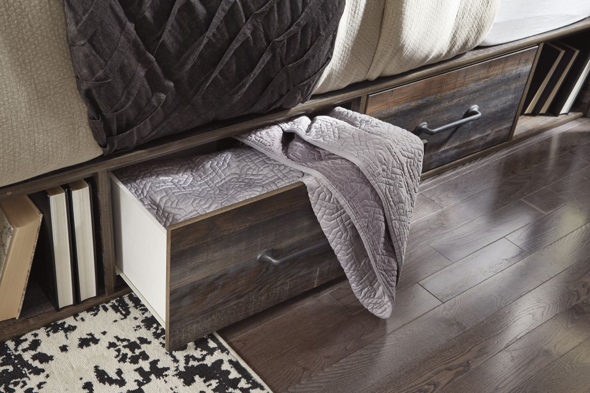 Enhance the industrial design in your bedroom with the Drystan king panel storage bed's rustic charm.