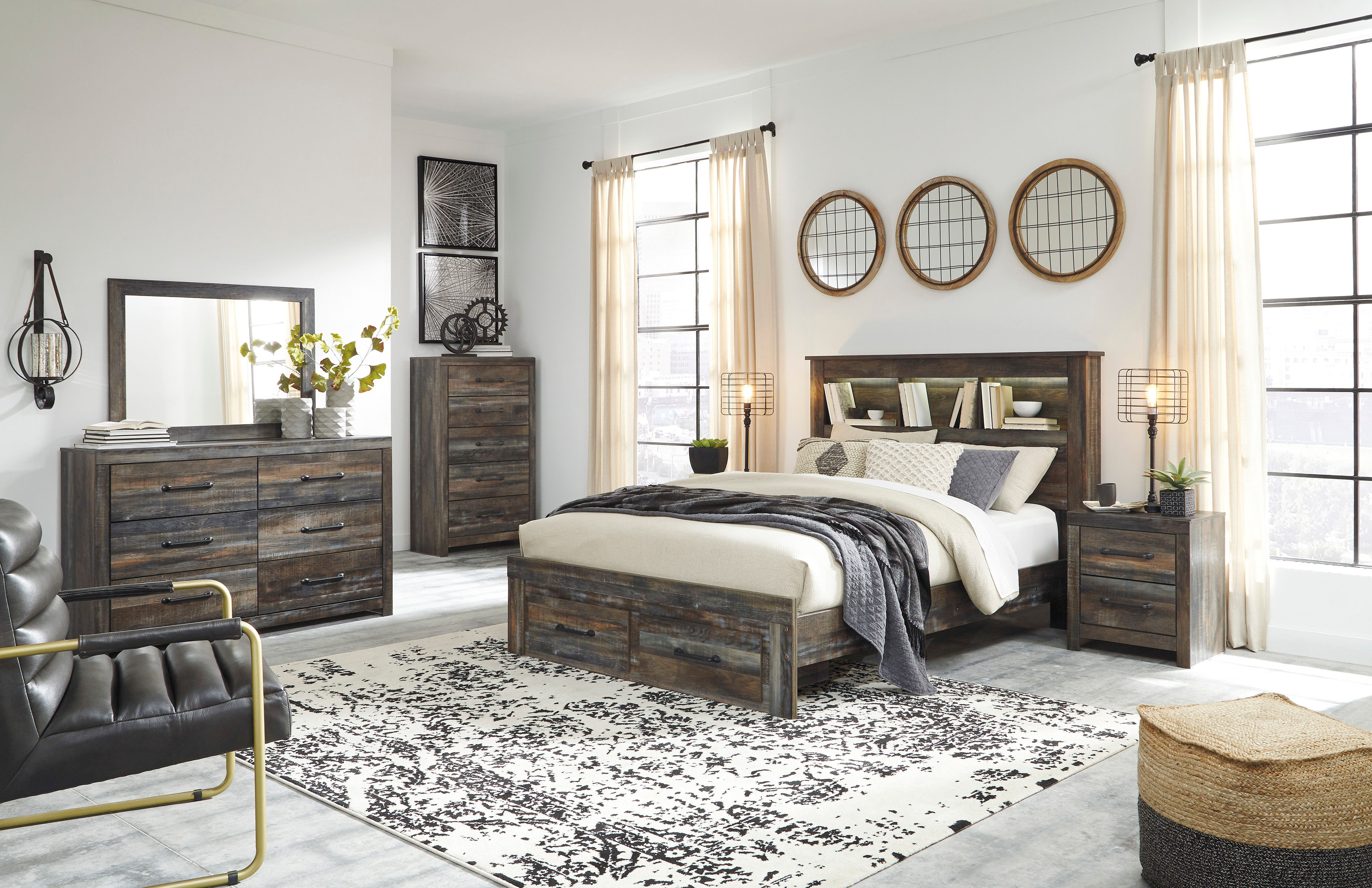 Enhance the industrial design in your bedroom with the Drystan queen bookcase storage bed's rustic charm.