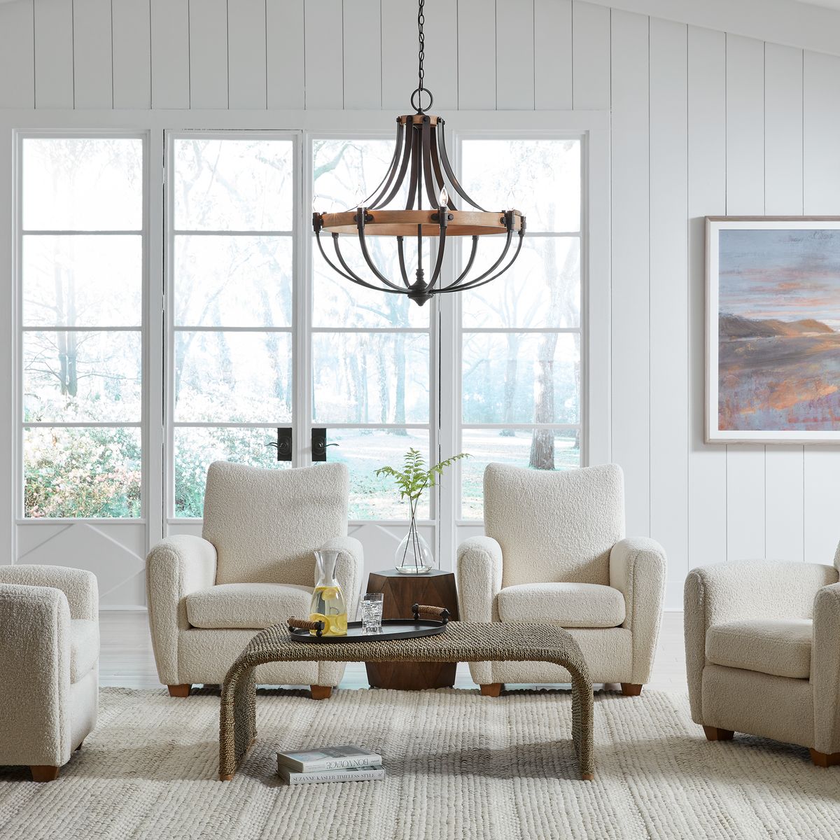 Updated empire shaped 8 Lt. chandelier with a French influence, featuring a ring of natural oak a bronze metal frame. 8-60 watt max, candelabra sockets. Bulbs not included. Supplied with 20' wire and 7' chain for adjustable installation.