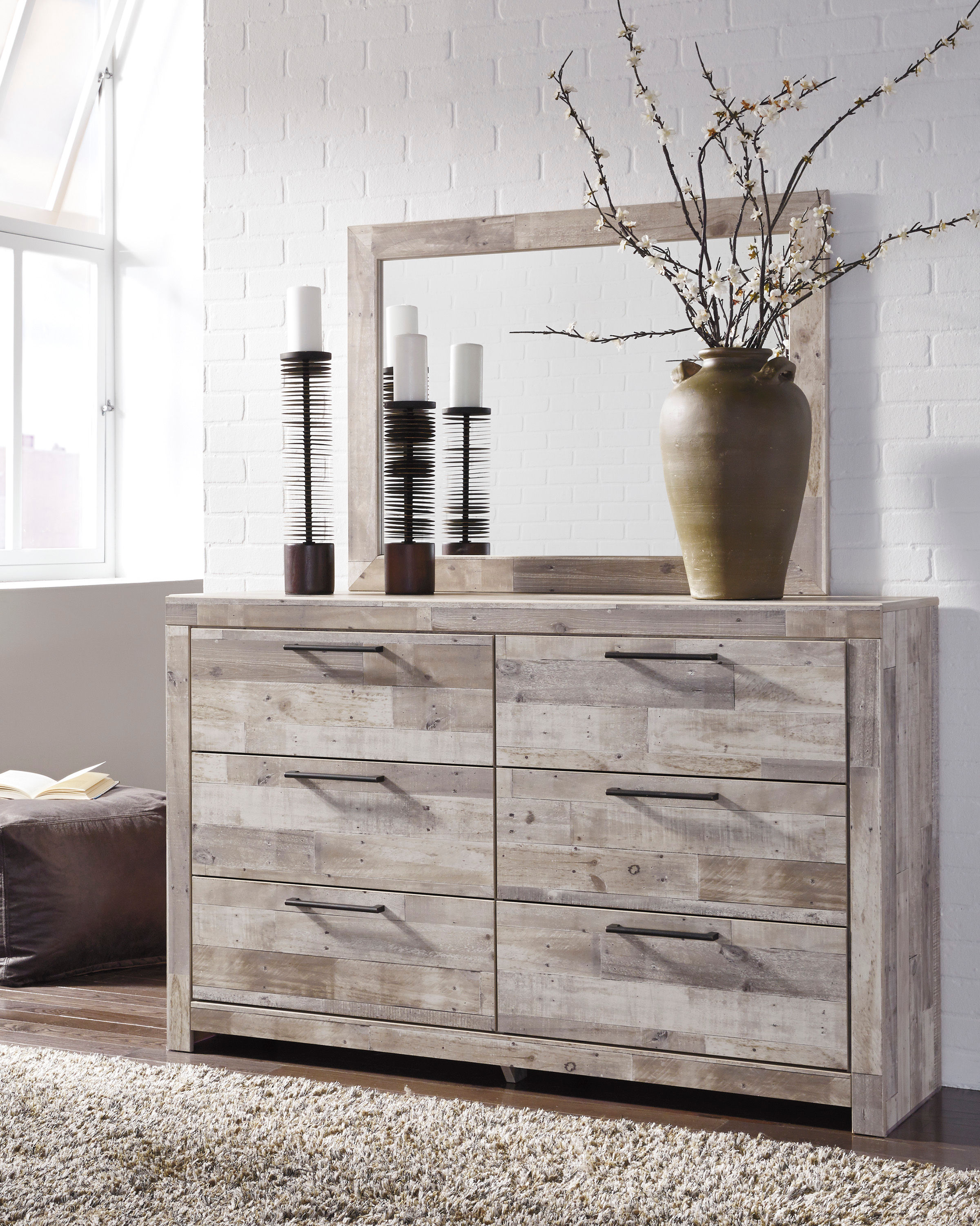 Butcher block has long been a staple in the kitchen, but the Effie dresser and mirror set transforms it into something fresh and new in the bedroom. A vintage whitewashed finish over replicated wood grain lends an urban farmhouse aesthetic to your restful retreat. Best of all—clean, linear design includes six roomy drawers that beautifully accommodate.
