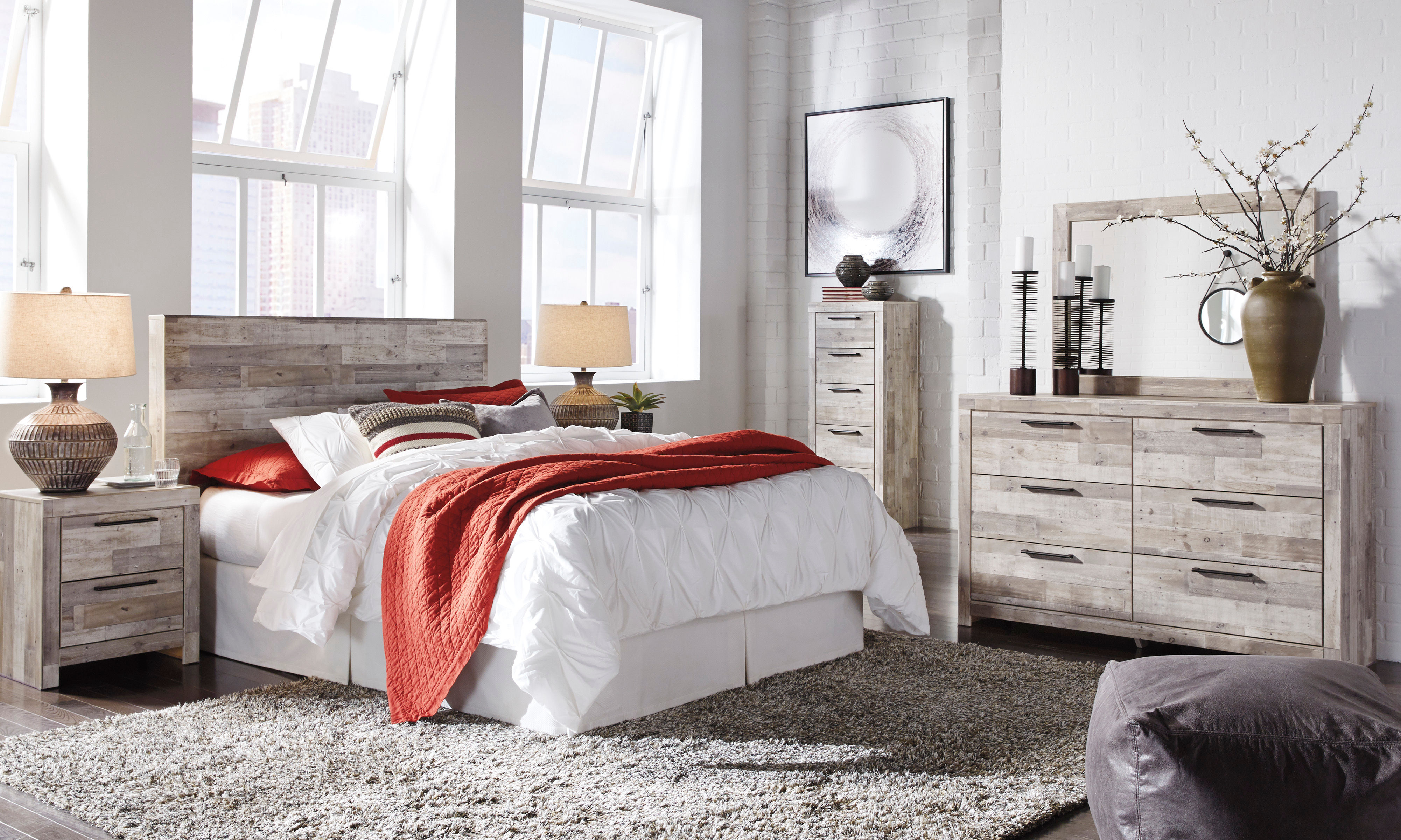 Butcher block has long been a staple in the kitchen, but the Effie queen panel headboard transforms it into something fresh and new in the bedroom. A whitewash finish over replicated wood grain lends an urban farmhouse aesthetic to your restful retreat. Bed frame available, sold separately.