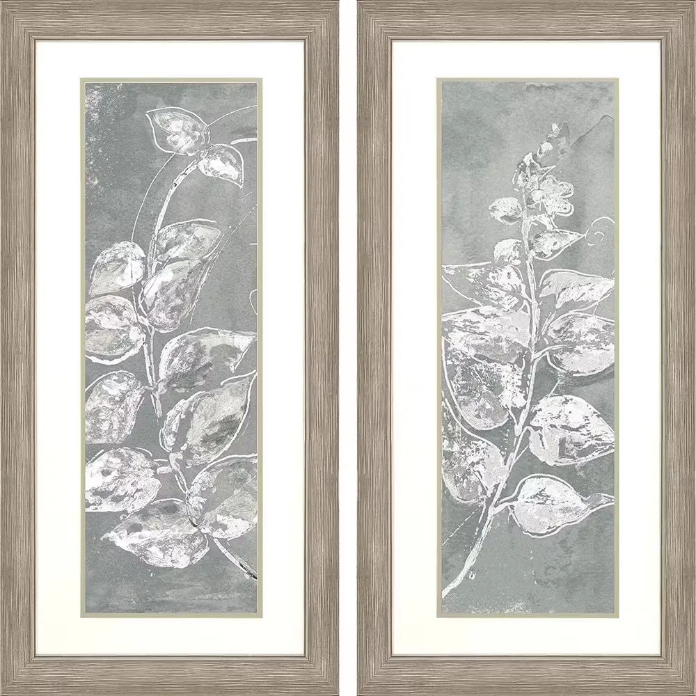 The gray and white Elegant Leaves Wall Art Set of two showcases traditional style with a distressed design.
