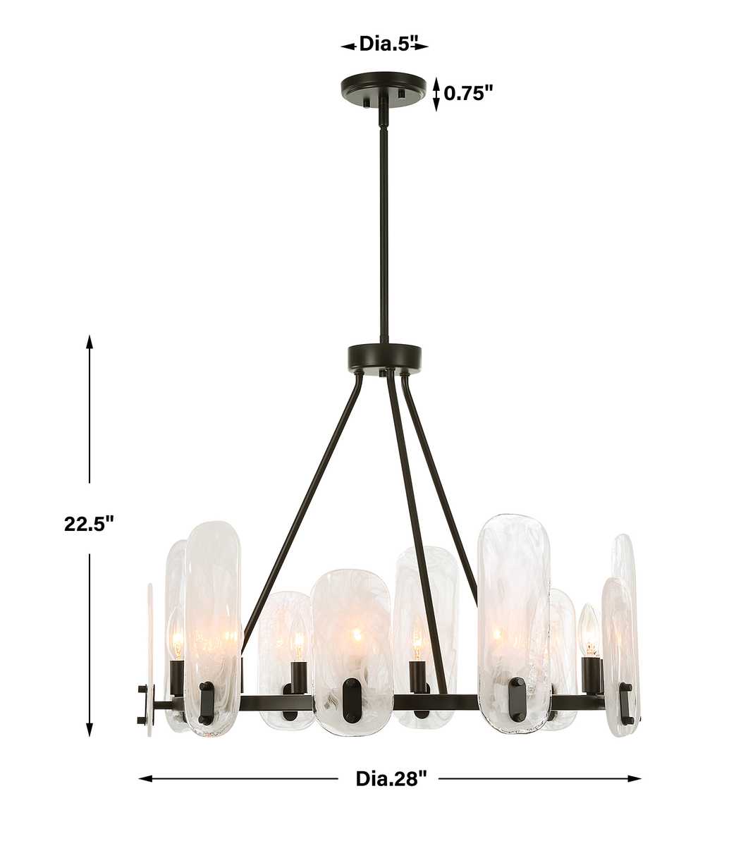 We started with a traditional ring in dark bronze then we added playful alternating heights of oval white swirl glass held in place with dark bronze binders giving us a wonderful classic chandelier. 10-60 watt max candelabra sockets. Bulbs not included. Supplied with 15' wire, 3-12" stems and 1-6" stem for adjustable installation.
