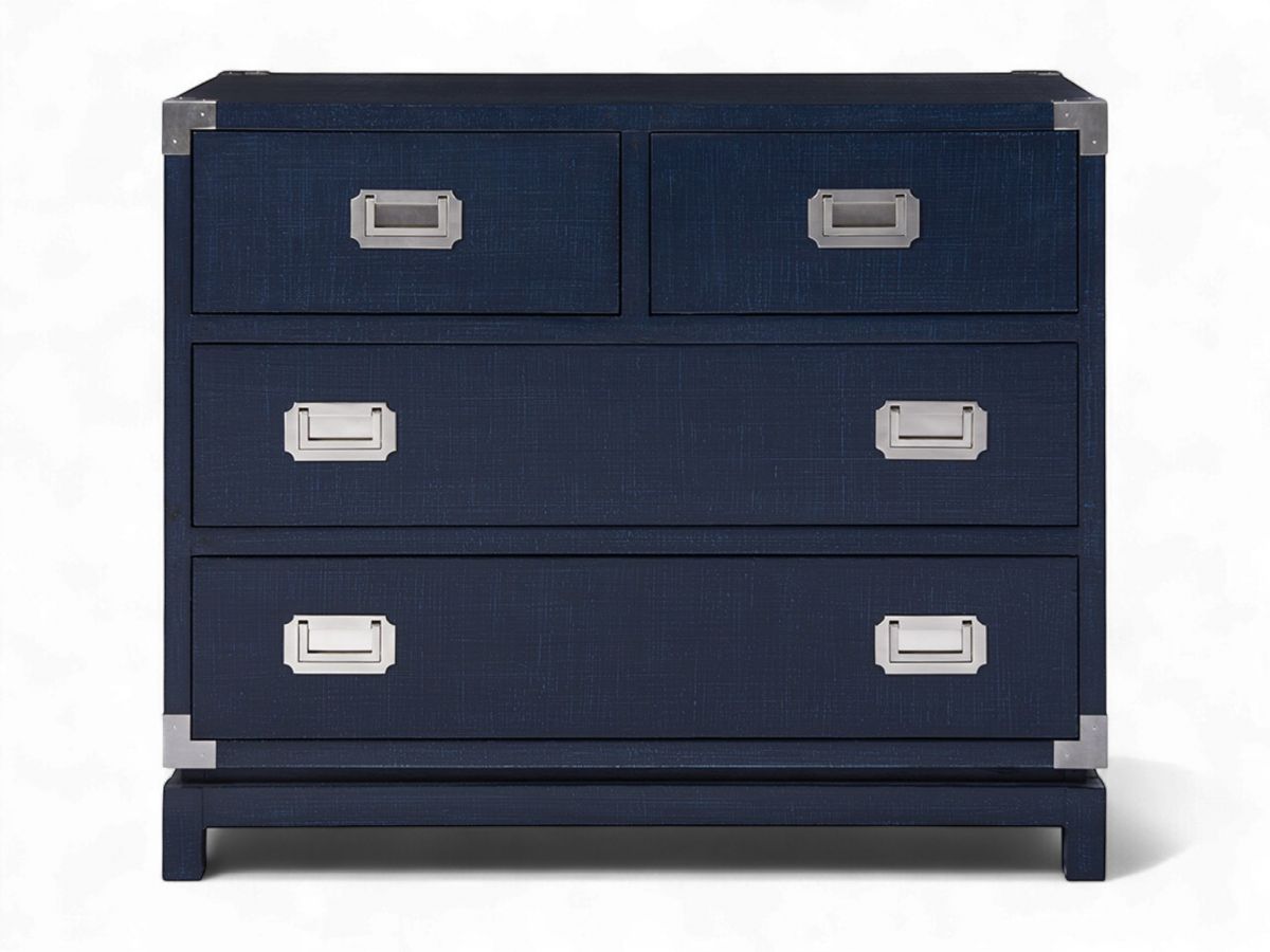 A stunning Marina finish and a vintage trunk-inspired frame define the Coastal Campaign Chest, a bold accent piece built with four drawers and chic inset hardware.