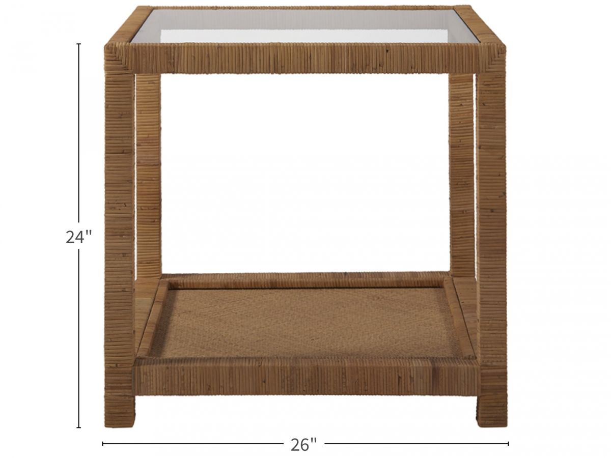 A coastal-inspired design, the Escape end table features a rattan body and glass top for a relaxed look.