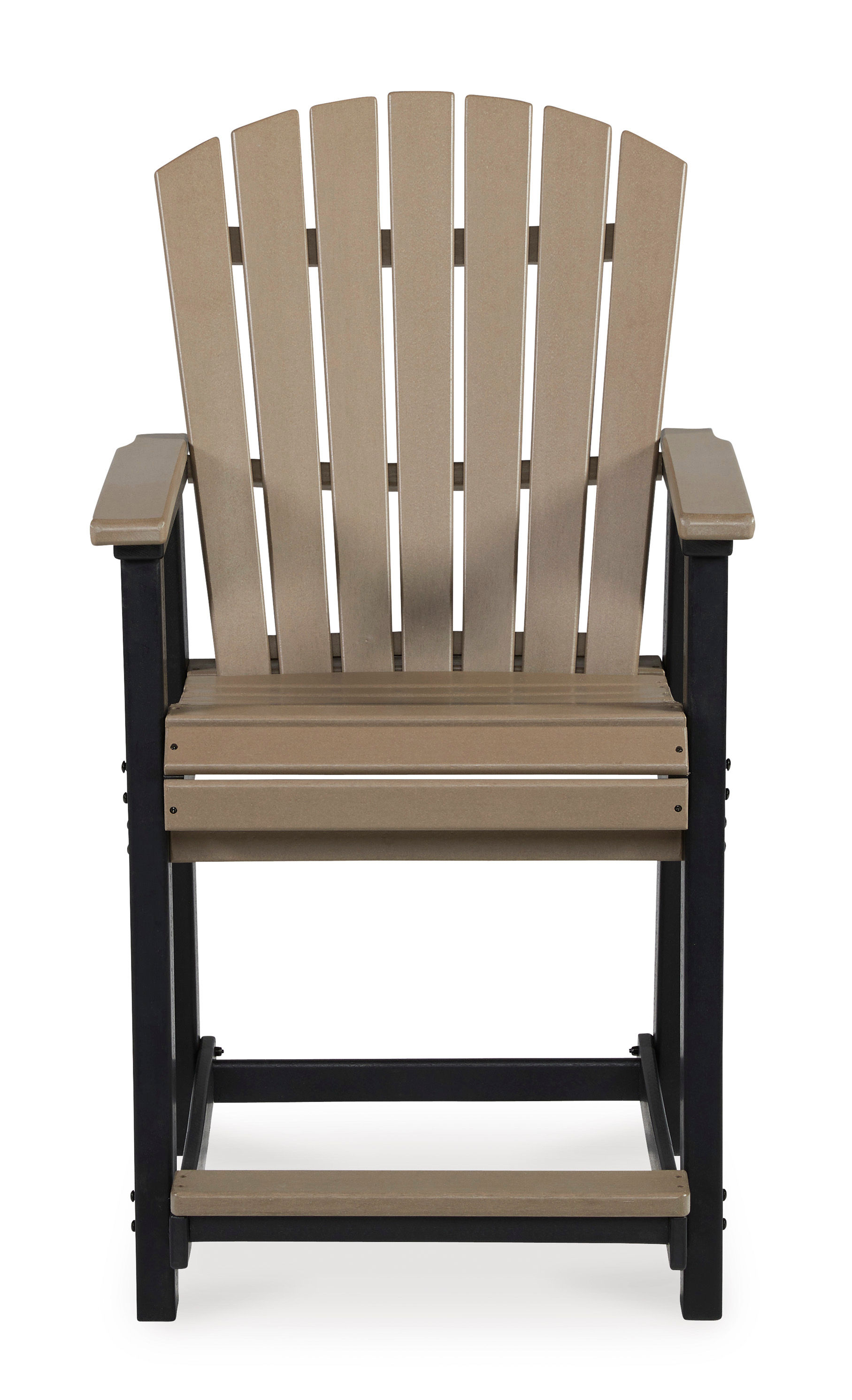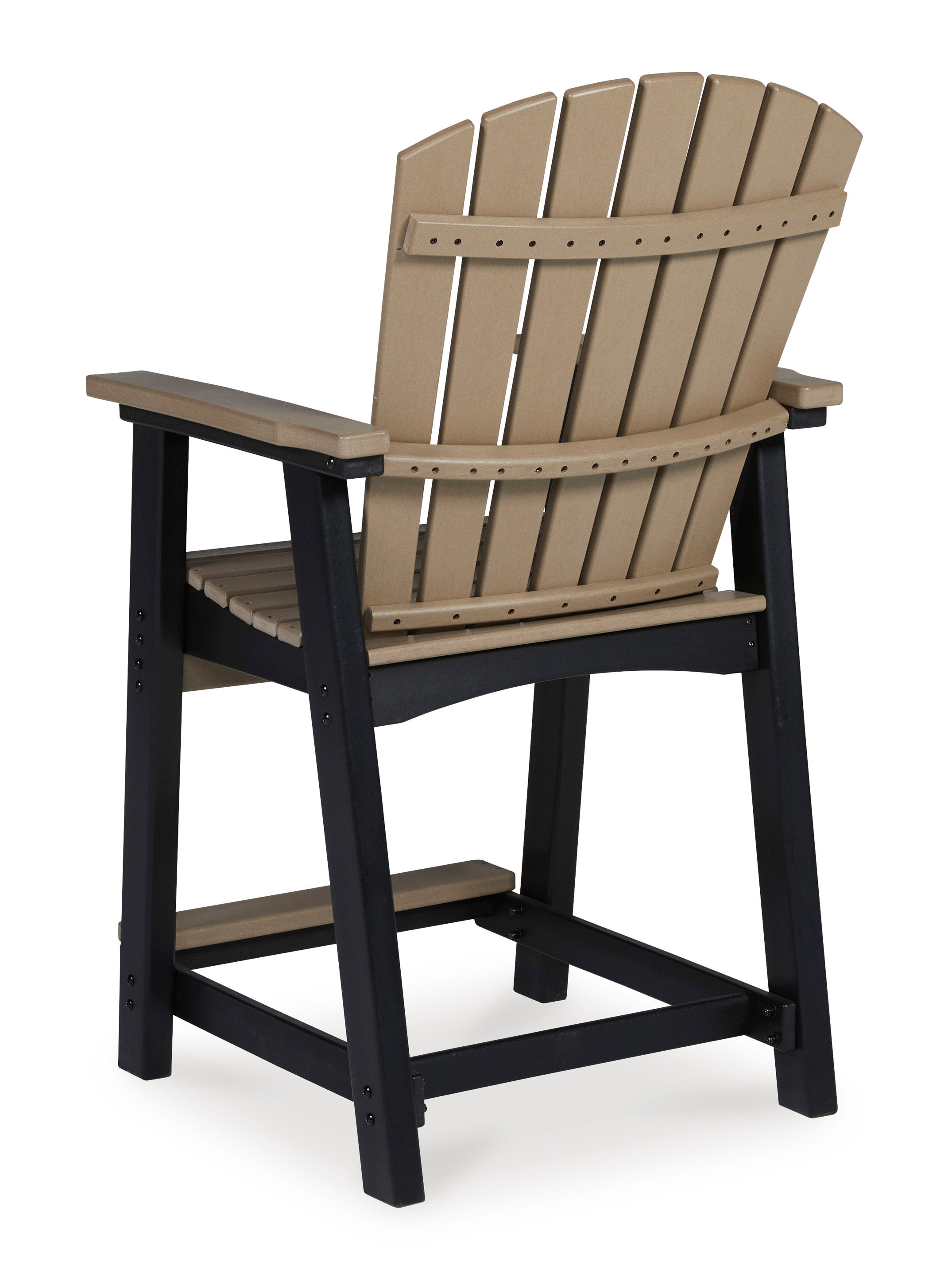 Raise the bar on outdoor living with the Fairen Trail bar stool. Crafted for style and durability, this outdoor bar stool set caters with sturdy armrests, an ample footrest, high shell back and waterfall wrapped seat for curvaceous comfort. Adding to its appeal: a standout two-tone finish that pairs a light driftwood and black for twice the interest and a slatted design to easily shed rainwater.