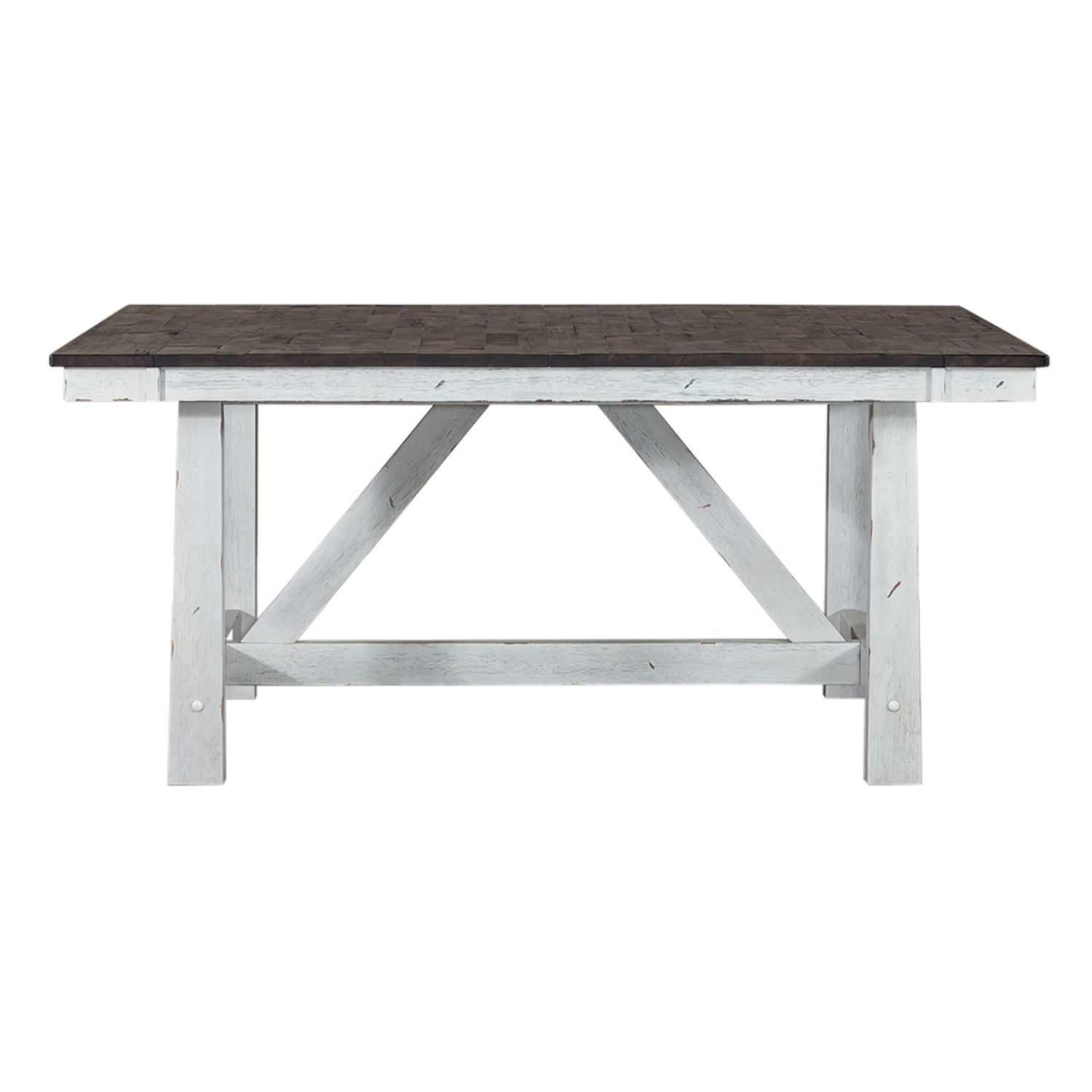 Gather the whole family with the Farmhouse trestle table. Crafted of rubberwood solids and veneers, this piece features a timeless heavy distressing, two removeable 18" leaves to comfortably seat up to eight, an "X" style trestle base, and a solid wood top. The two-tone white finish with wood tone tops creates a versatile look that is sure to be the perfect addition to any space.