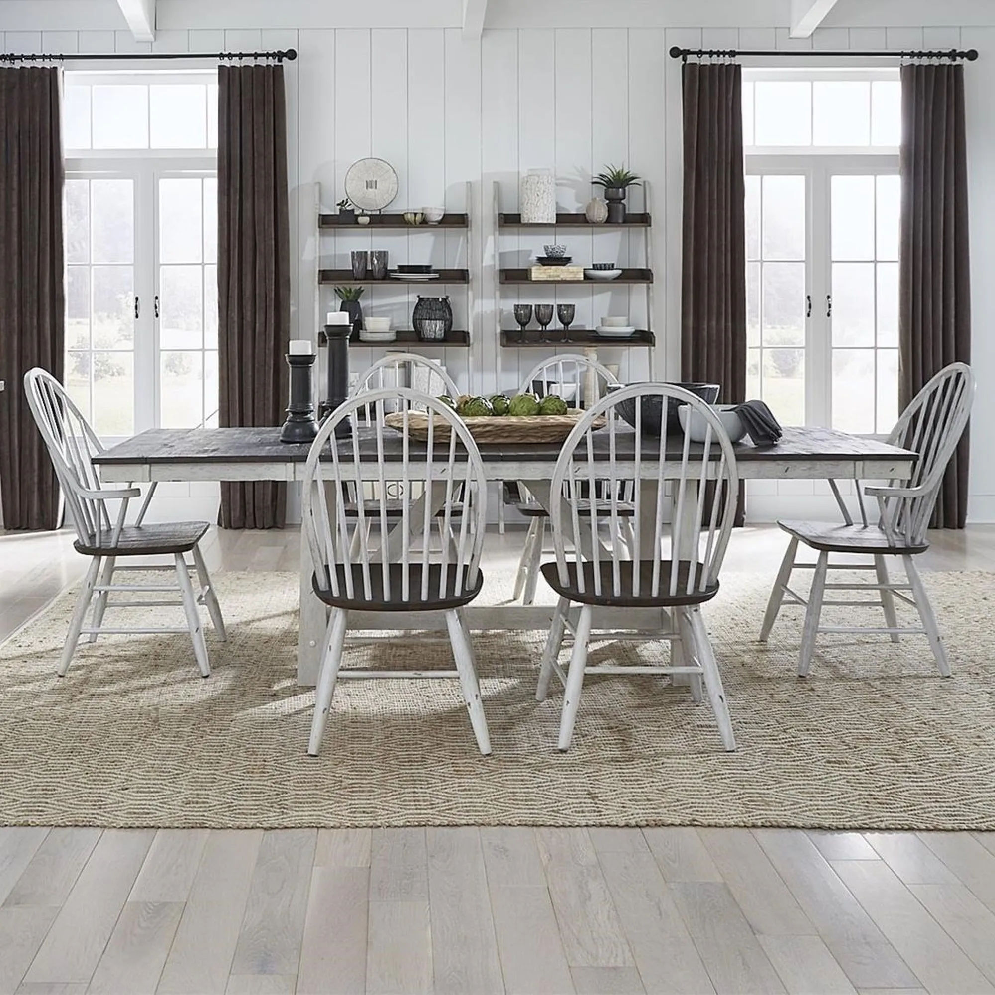 Sitting pretty with the Farmhouse seven-piece trestle table set. Crafted of rubberwood solids and veneers, this kit includes the fixed-top trestle table and six Windsor back side chairs. The trestle table features a timeless heavy distressing with a two-tone white and wood-tone finish with a planked top. The Windsor chairs, known for their comfort, feature nylon chair glides to protect your flooring and the same two-tone finish as the table.