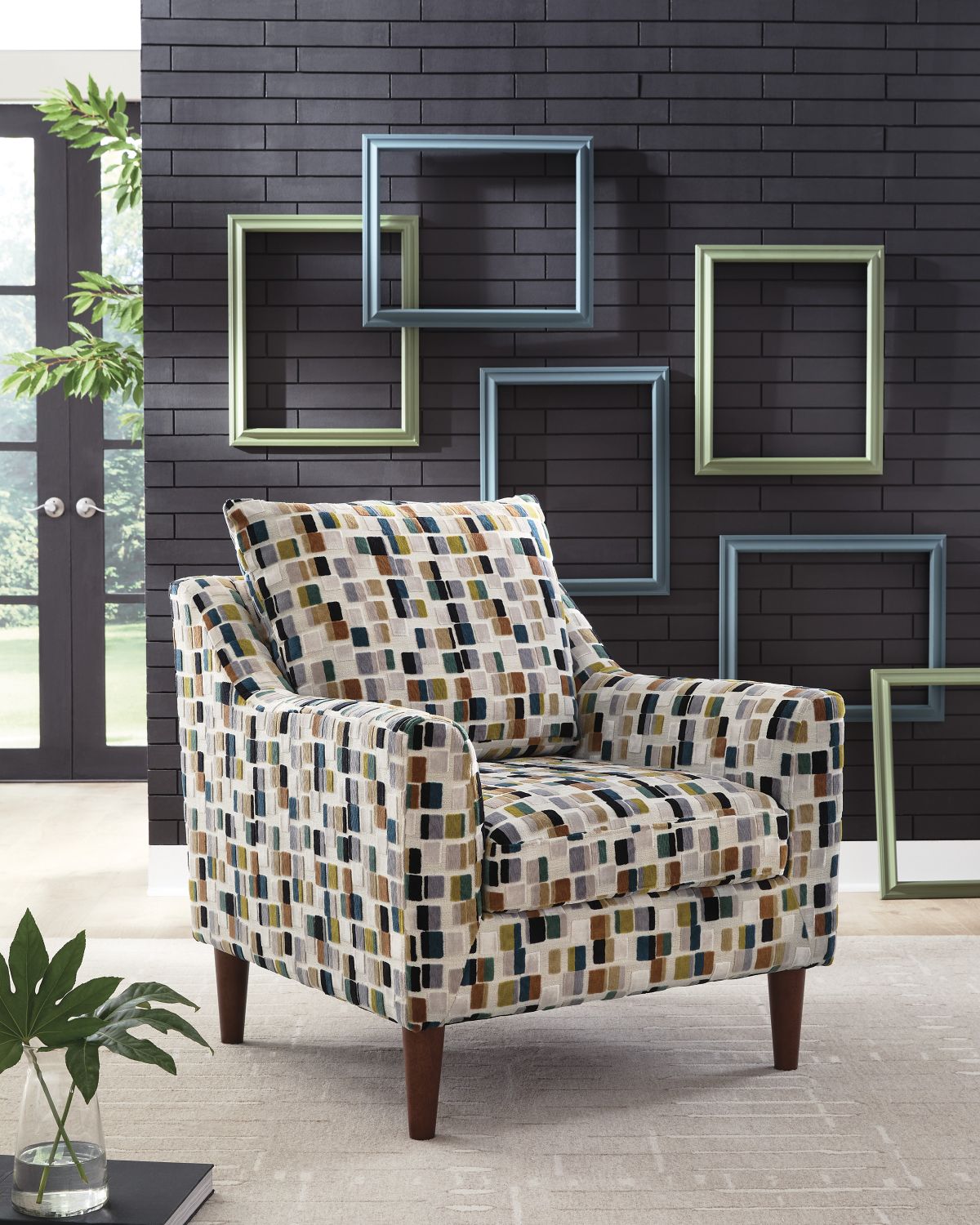 Classic elegance meets the vibrant multicolor block pattern on the Fenna accent chair.