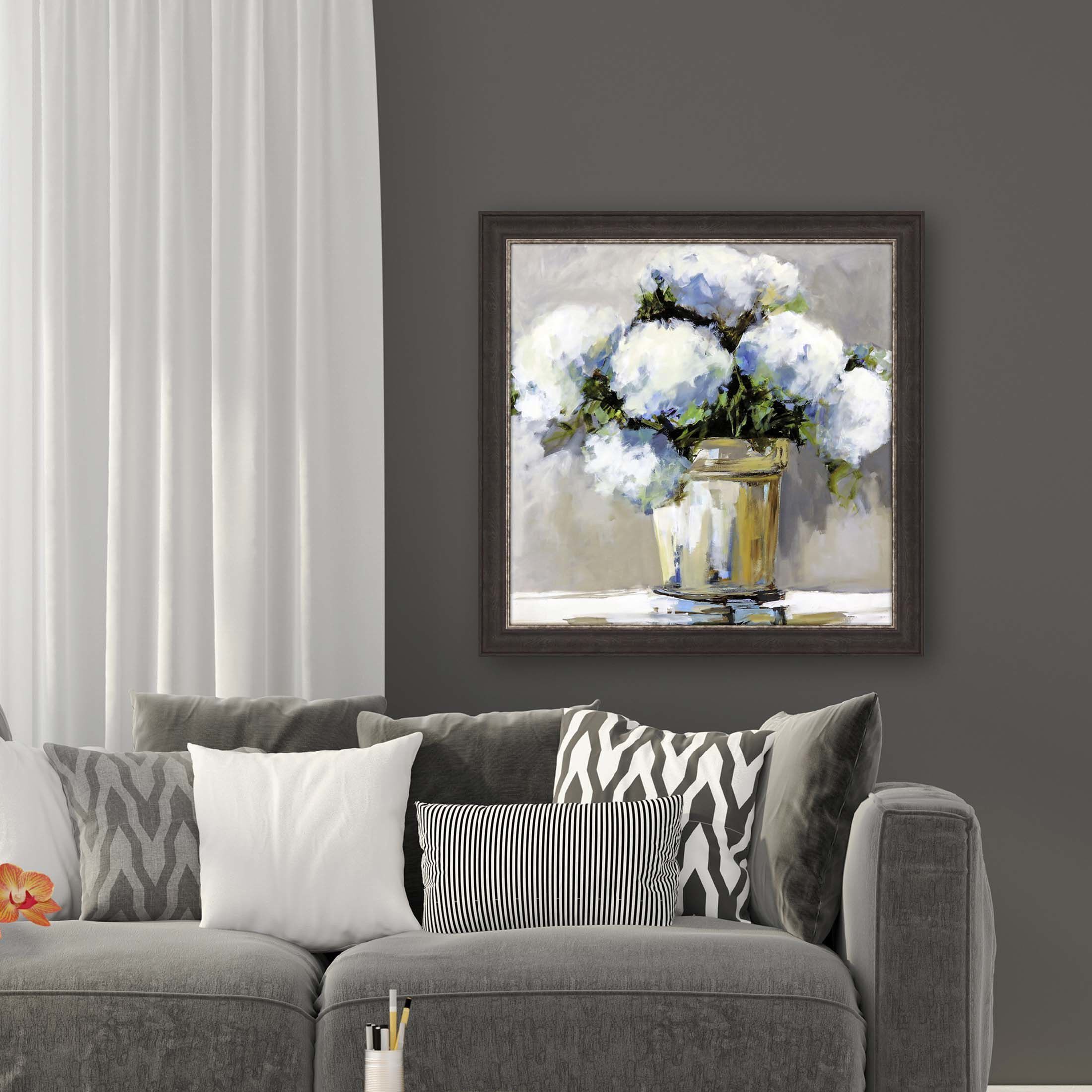 A floral bouquet of white hydrangeas features a hand applied enhanced gel finish. Framed in an espresso wood grain finish moulding with silver lip.