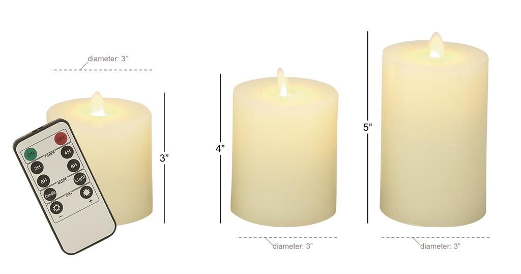 Designed with timeless sophistication, rich old-world textures and warm hues come together for a refined classic taste of luxury. These exquisite flameless candles are made of solid LED wax. These stunning LED flameless candles features a smooth cream wax body finish. This dimmable LED candle with remote showcases 3-set cylinder candles in various heights and a lavish textured foil exterior design.