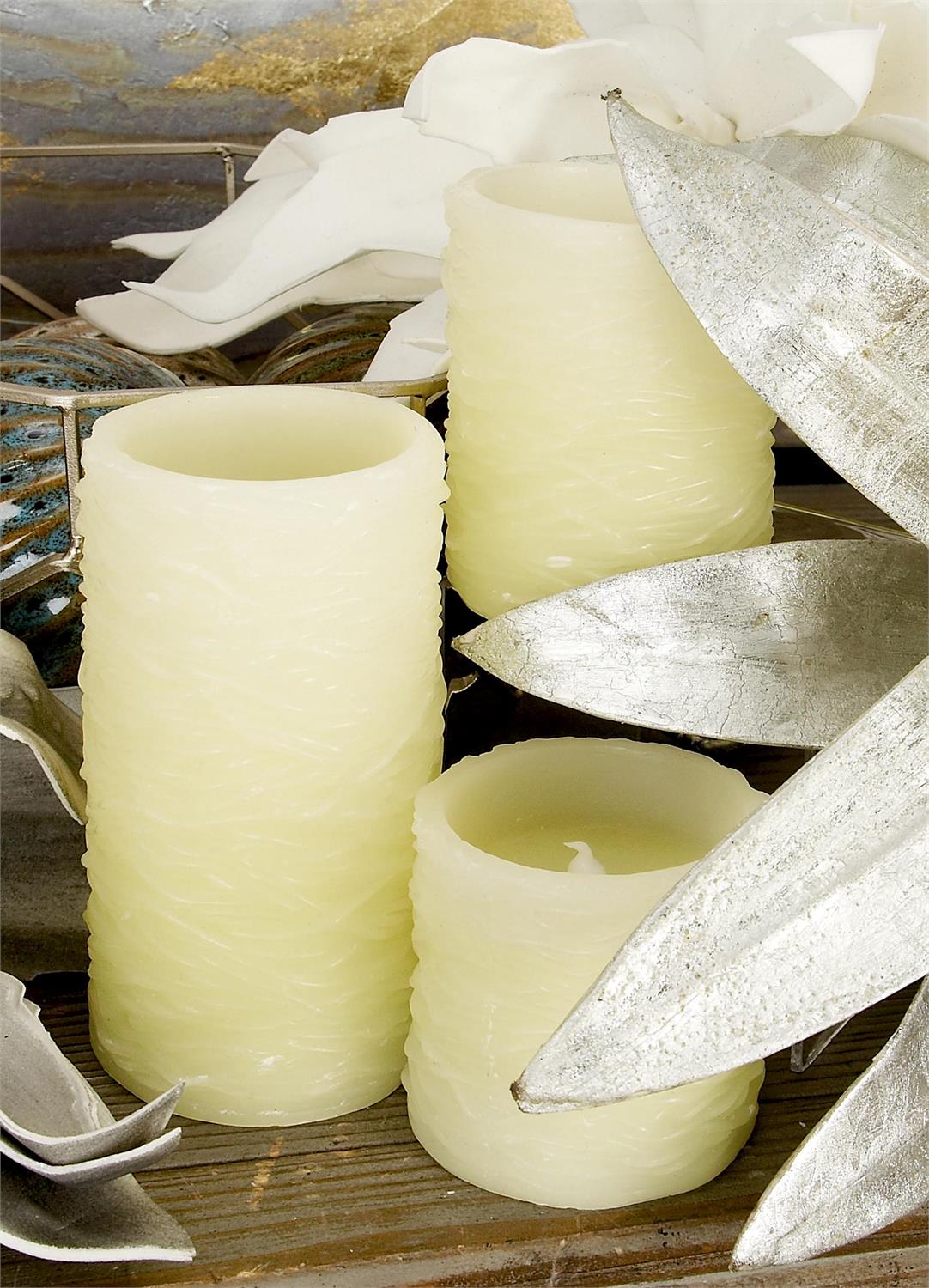 • Textured cream realistic flameless candles offer round shapes with intricate textured foil patterns for an elegant touch