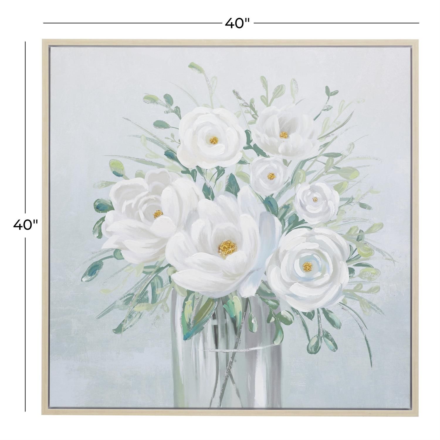 Designed with ornate details, soft hues, and timeless romance to create an elevated wholesome atmosphere. The white living room framed wall art is crafted from iron, polystone, fir wood, and canvas materials. The square decorative framed wall art highlights a flower vase painting with a textured finish and white, gold, silver, and green colors in a light brown frame. This canvas framed wall art features delicately painted flowers with soft colors that captivate the eye.