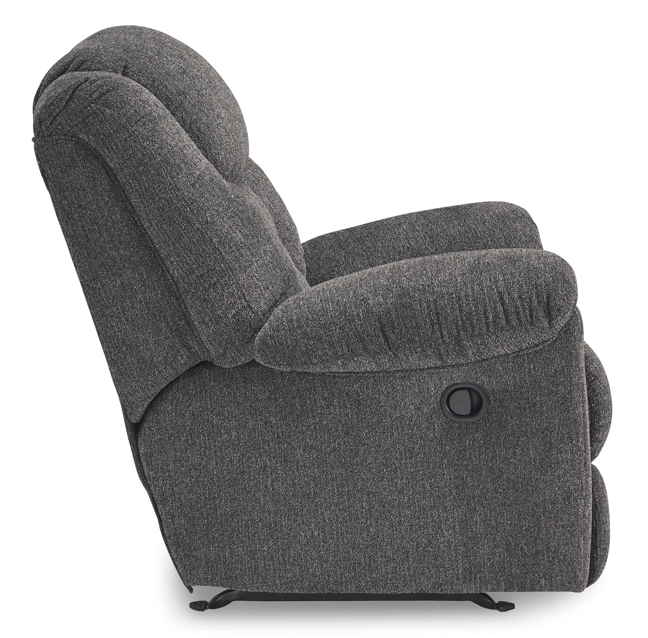 The easy-clean fabric on the charcoal gray Foreside recliner meets modern comfort.