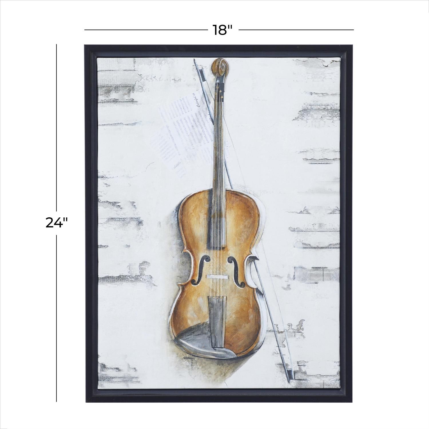 A classic and timeless style of design for your traditional home setting. This dashing violin wall art is crafted from polystone, iron, Chinese fir wood, and canvas fabric. This black framed canvas wall art features a brown finished violin with a smoky gray, white, and black background display. This violin canvas wall art showcases a pencil-stroked image of a violin and a musical sheet lying directly on the ground.