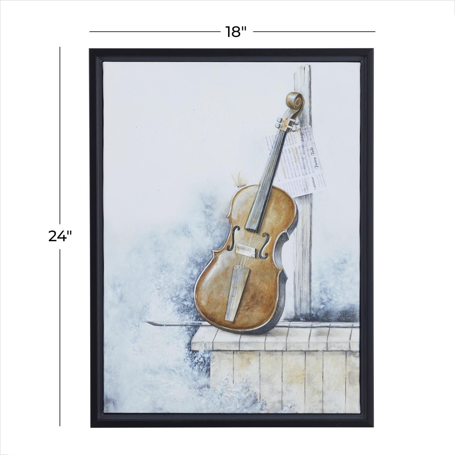 A classic and timeless style of design for your traditional home setting. Black framed canvas wall art features a brown finished violin with a smoky gray, white, and black background display. Musical violin wall art is crafted from polystone, iron, Chinese fir wood, and canvas fabric. Violin canvas wall art showcases a pencil-stroked image of a violin resting in front of a tall wooden plank with a dangling musical sheet.