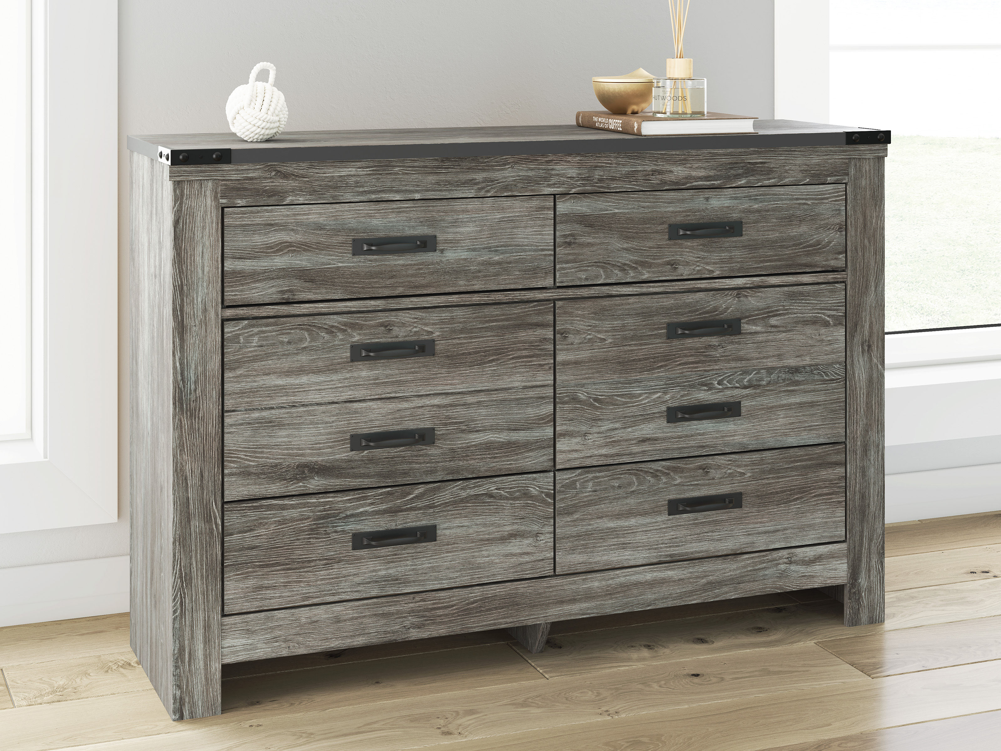 Cool, casual style is for all ages. With this dresser, they get the function they need plus the refined design you love. Approachably neutral in a rustic warm gray, it’s adaptable enough to pair with an assortment of existing colors and room decor. Faux metal detailing on the corners lends an industrial edge. Smooth-gliding drawers offer storage for clothes, toys and everything in between.