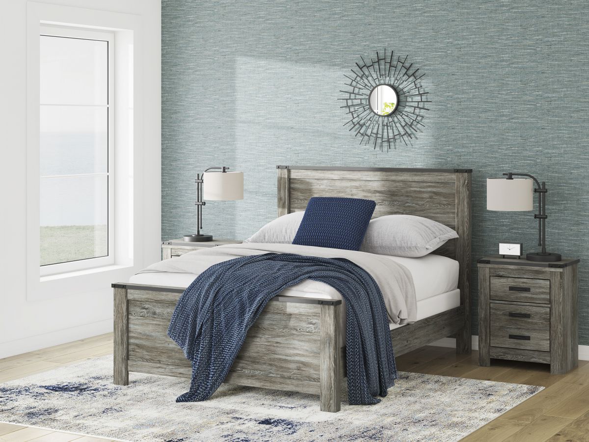 Embrace refined, casual style with the Frandern queen size bed in a rustic warm gray finish.