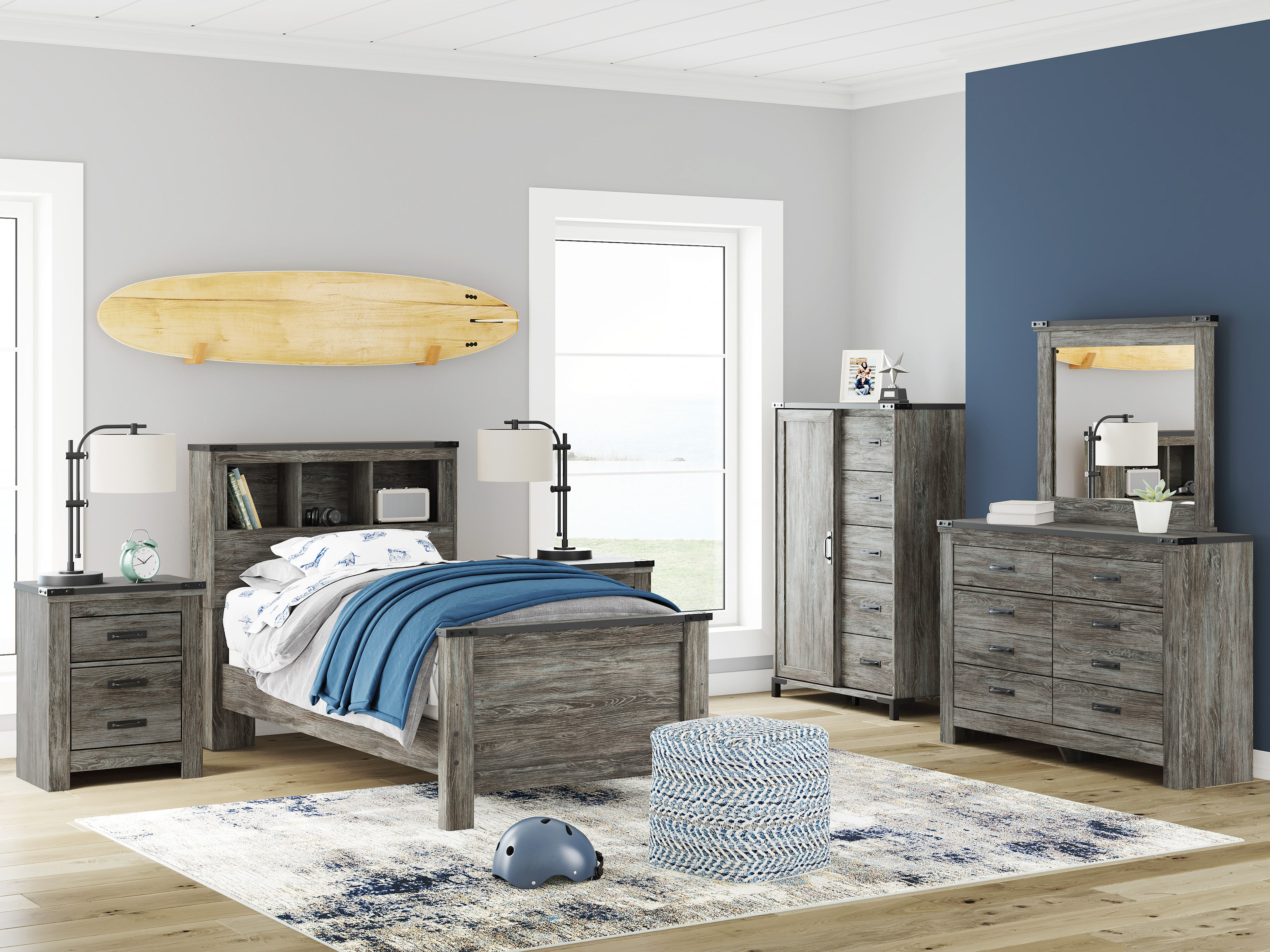 Cool, casual style is for all ages. With this twin bookcase panel bed, they get the function they need plus the refined design you love. Approachably neutral in a rustic warm gray, it’s adaptable enough to pair with an assortment of existing colors and room decor. Faux metal detailing with nailhead accents lends an industrial edge. And handy storage cubbies in the headboard keep books, toys and other bedtime necessities within easy reach.