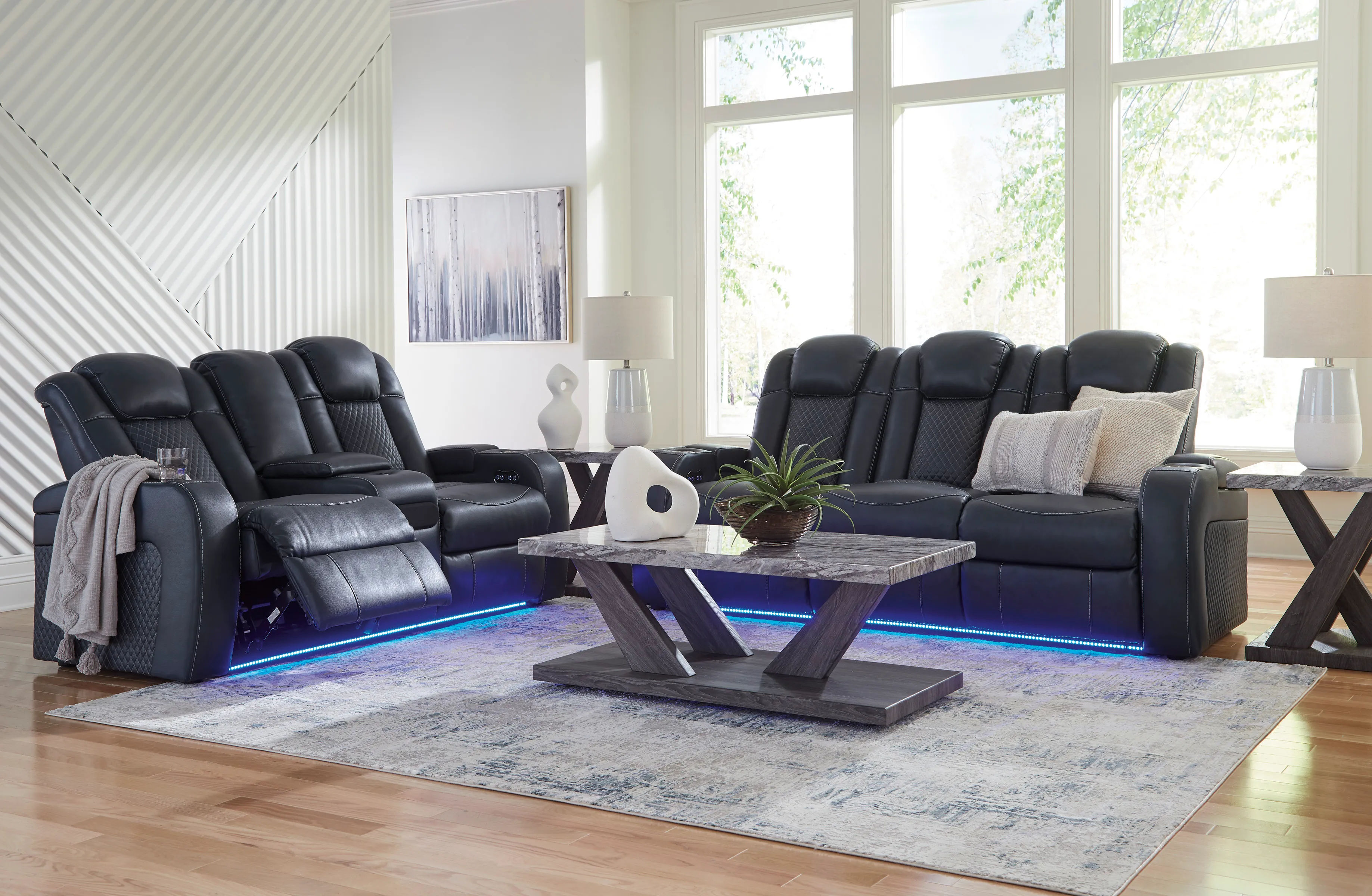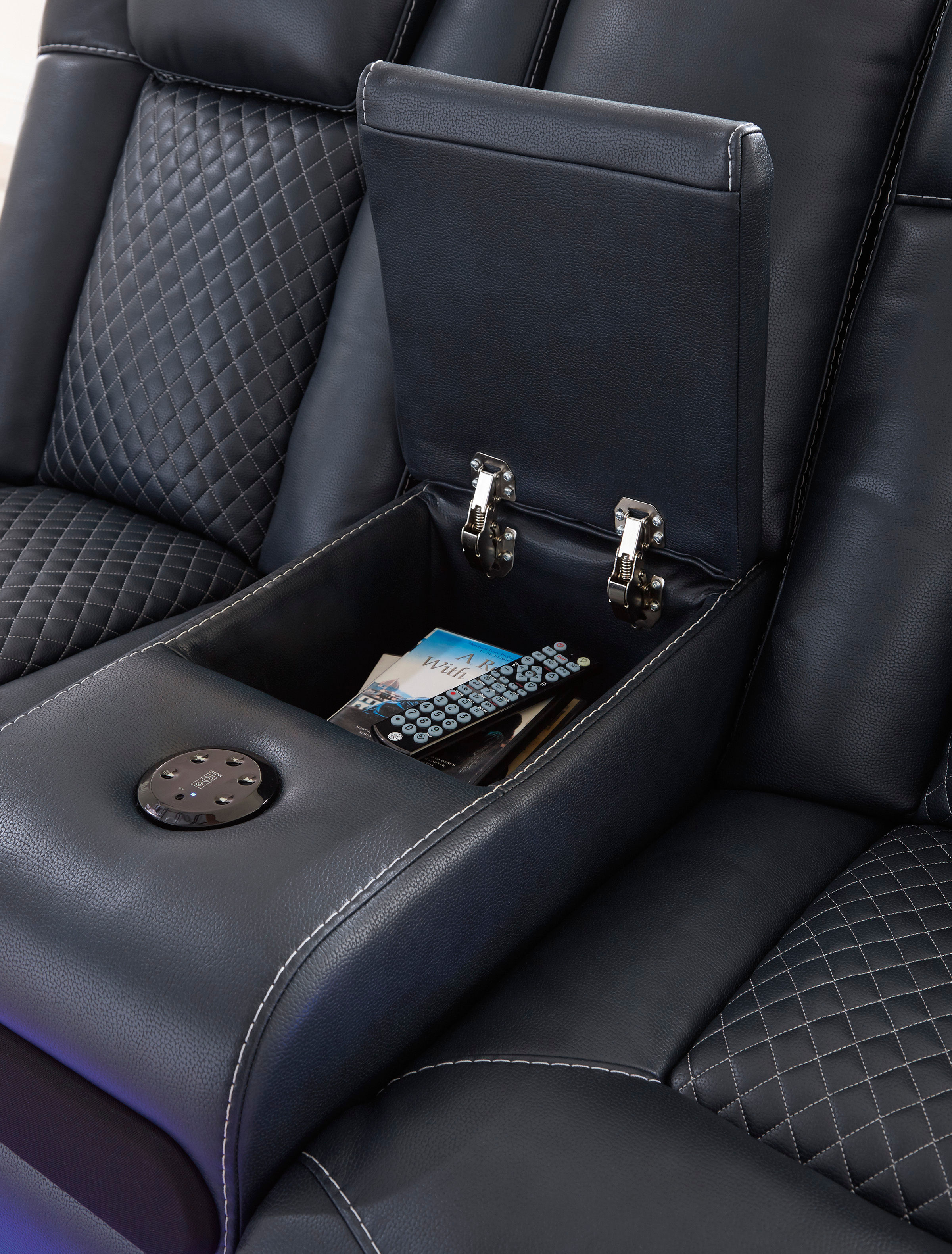 The Fyne-Dyme power reclining loveseat goes beyond basic comfort. It upgrades the everyday, turning your living room into an entertainment hub. Don’t want to leave your seat? Keep essentials in reach with cup holders and storage arms. You can create an even cooler vibe for family movie nights and friendly gaming matches with LED lights. Immerse yourself further with built-in wireless audio connectivity. And your sleek style isn’t compromised—its diamond stitching and streamlined arms recall the aesthetics of luxury automobiles.