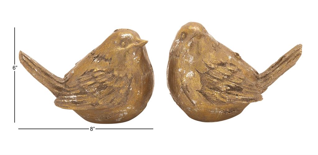 Infuse your home with cozy charm, where weathered textures, rustic finishes, and warm earthy tones create a wholesome atmosphere. Gold decorative sculpture set includes two bird sculptures made of polystone for a durable structure. Bird decorative statue set showcases a satin gold finish with touches of white that adds elegance to your space. The polystone set of 2 sculptures is designed with rounded perched figurine details, offering a unique and captivating aesthetic.