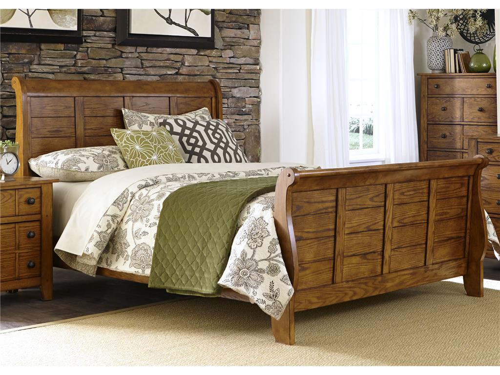Staple any room with this rustic American style sleigh bed. Constructed with select hardwoods and ash and oak veneers, this piece features an aged oak finish, center slat supports, and a bolt on rail system. With wood and peg accents, this bed is sure to bring uniqueness and functionality to any room, allowing for a craftsman feel.