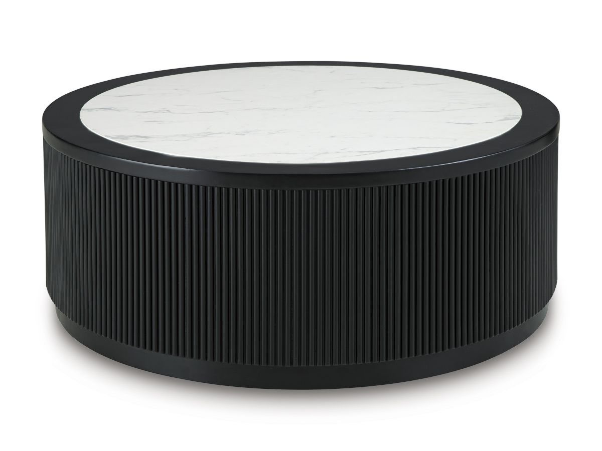 Casual contemporary design with a modern vibe, the Grayman coffee table will work perfectly in a variety of different styles. The light, classic matte black finish and white faux marble pattern adds visual interest, while the reeded drum design fits in modern interiors. The casters on the bottom make it easy to move around.