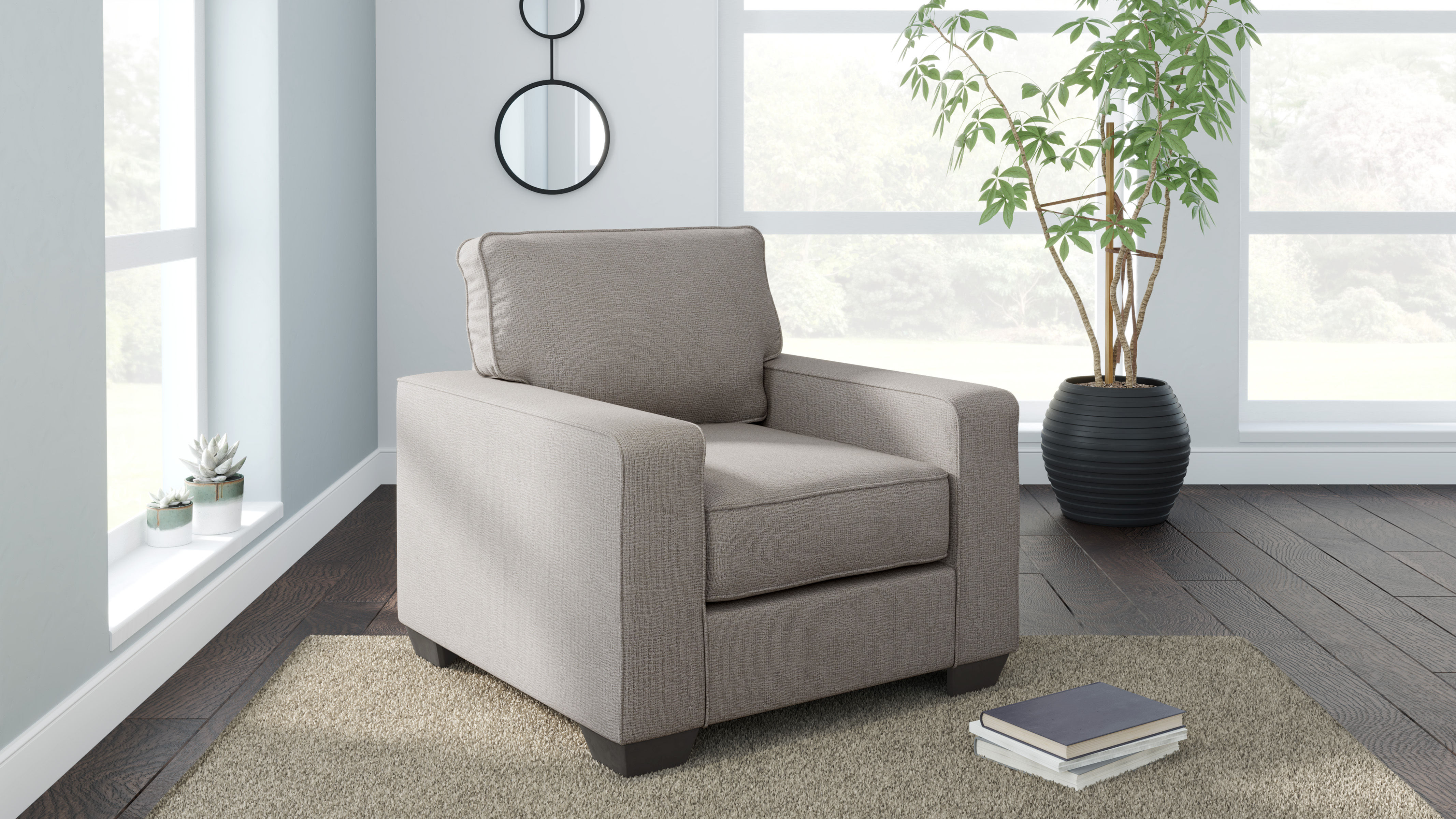 Make your living space that much more livable with the Greaves arm chair. Rest assured that its ultra-neutral upholstery with a textural chenille feel goes with anything and everything. Wide track armrests, box cushions and tapered feet lend a clean, contemporary aesthetic. Make it even more enticing by pairing it with the available matching ottoman and reserve yourself the best seat in the house.