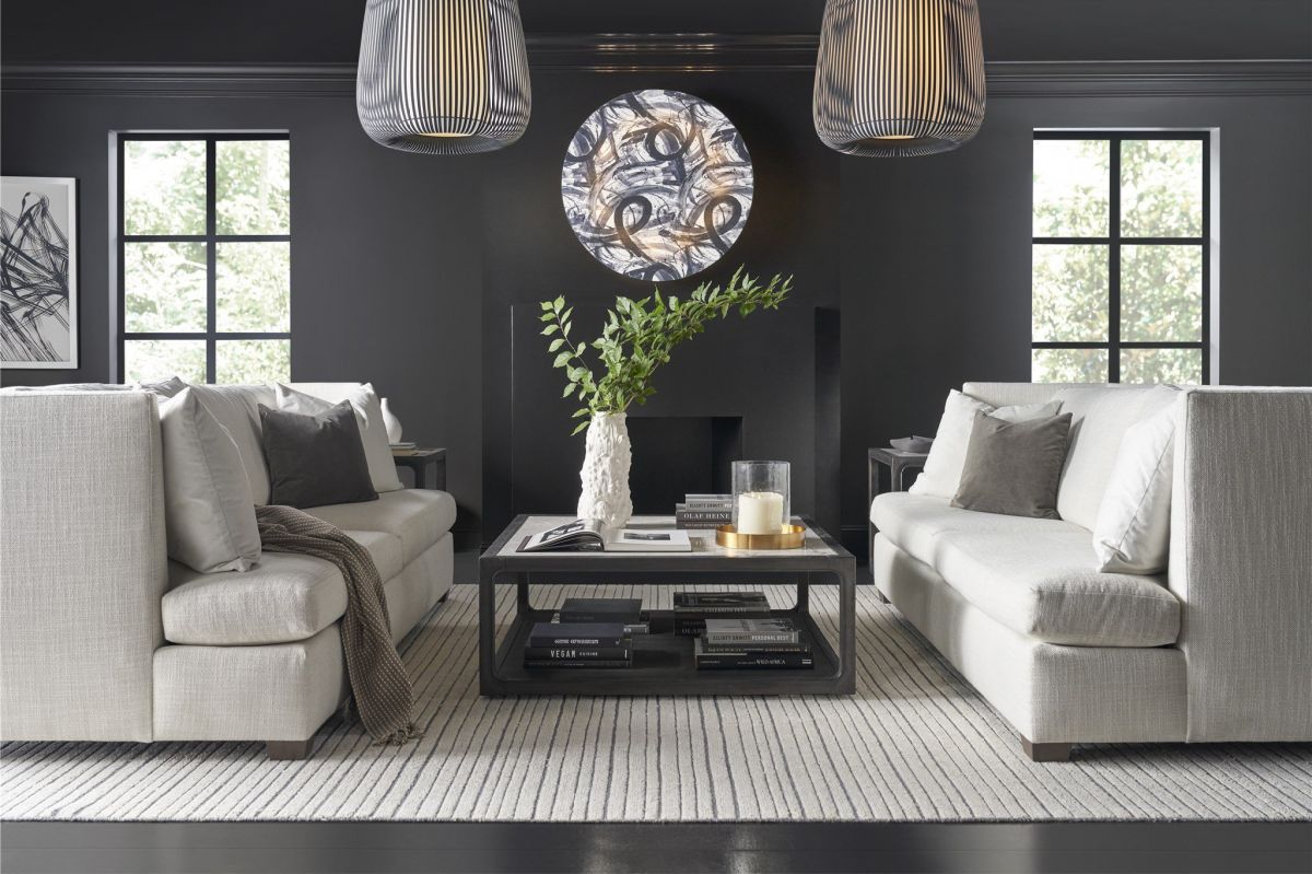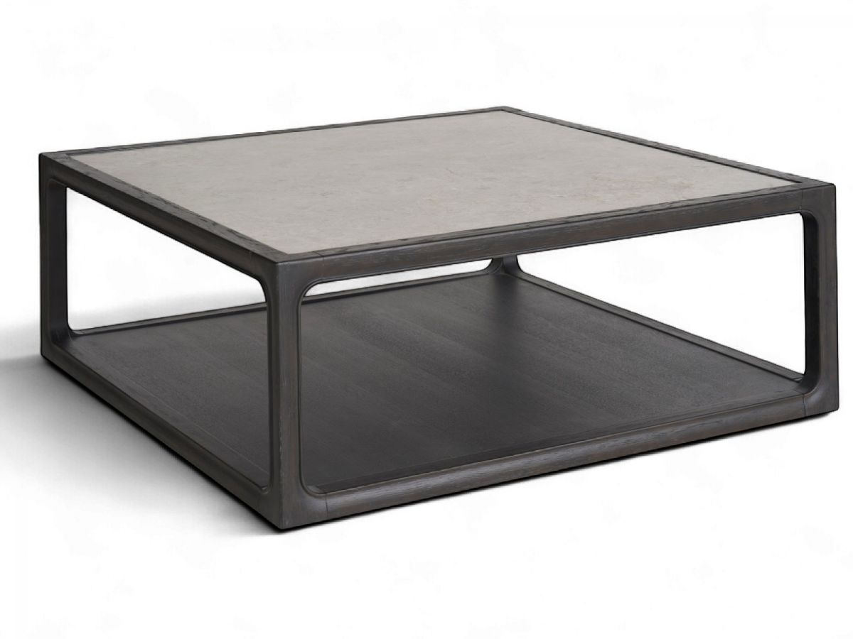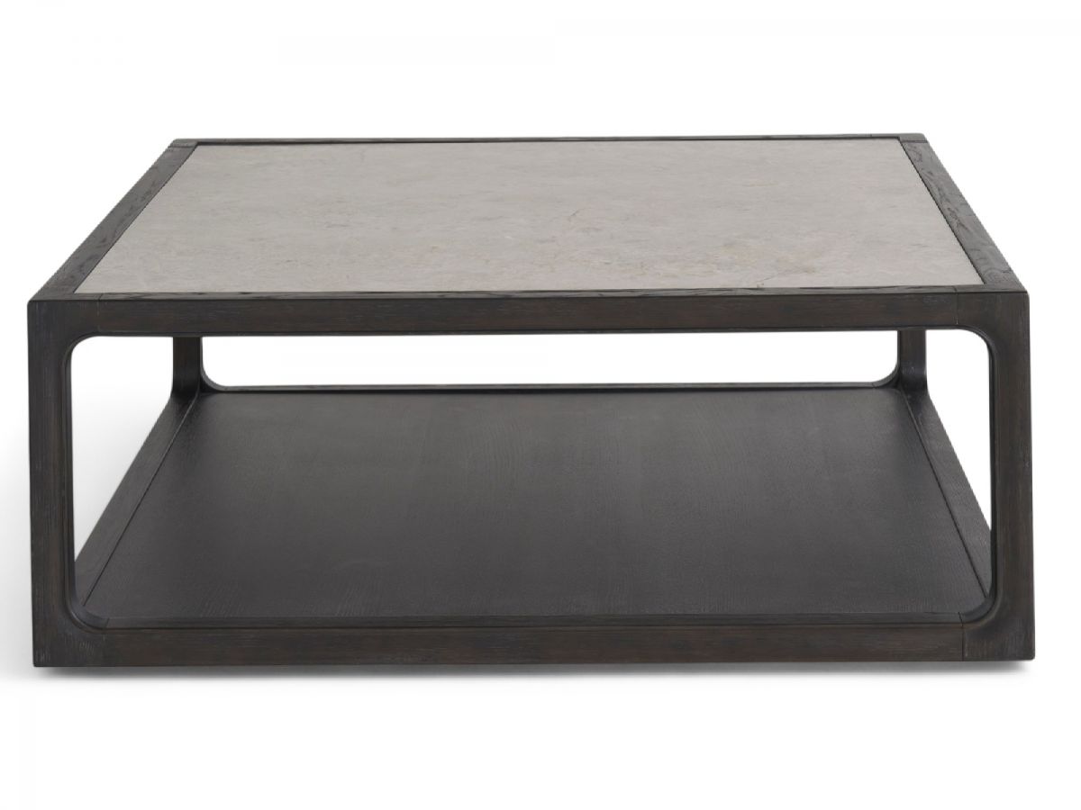 The Halen Cocktail Table, finished in the distinguished Ravenwood, showcases chic refinement with an inset stone top, offering a slender, yet impactful silhouette that anchors the living space with contemporary grace.