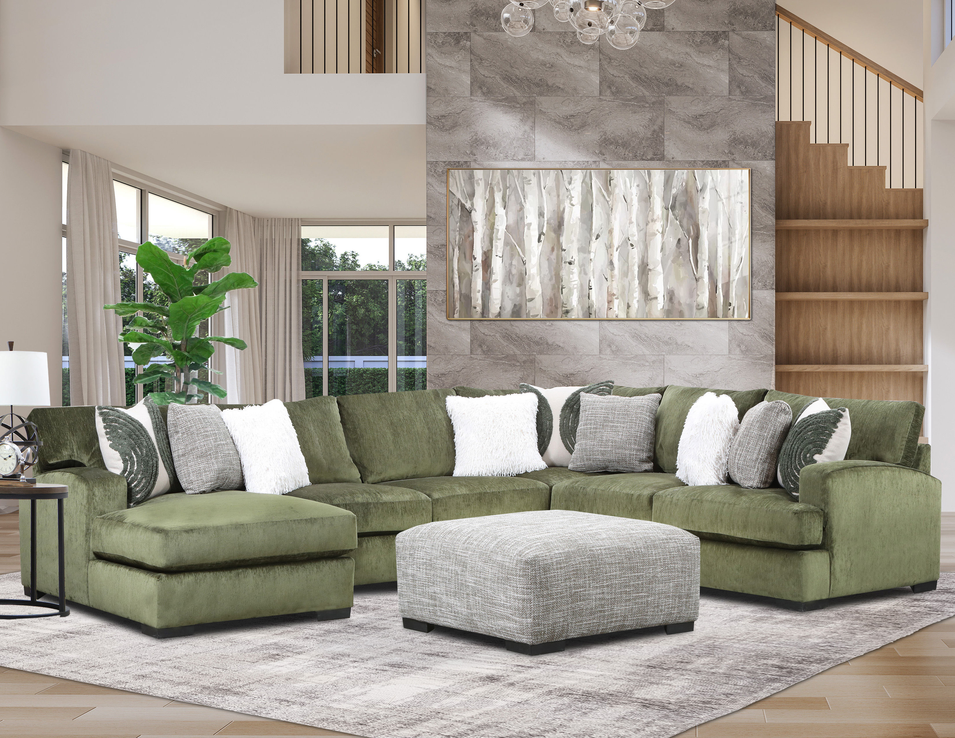 The dark green fabric upholstery on the Hana sectional will draw eyes.