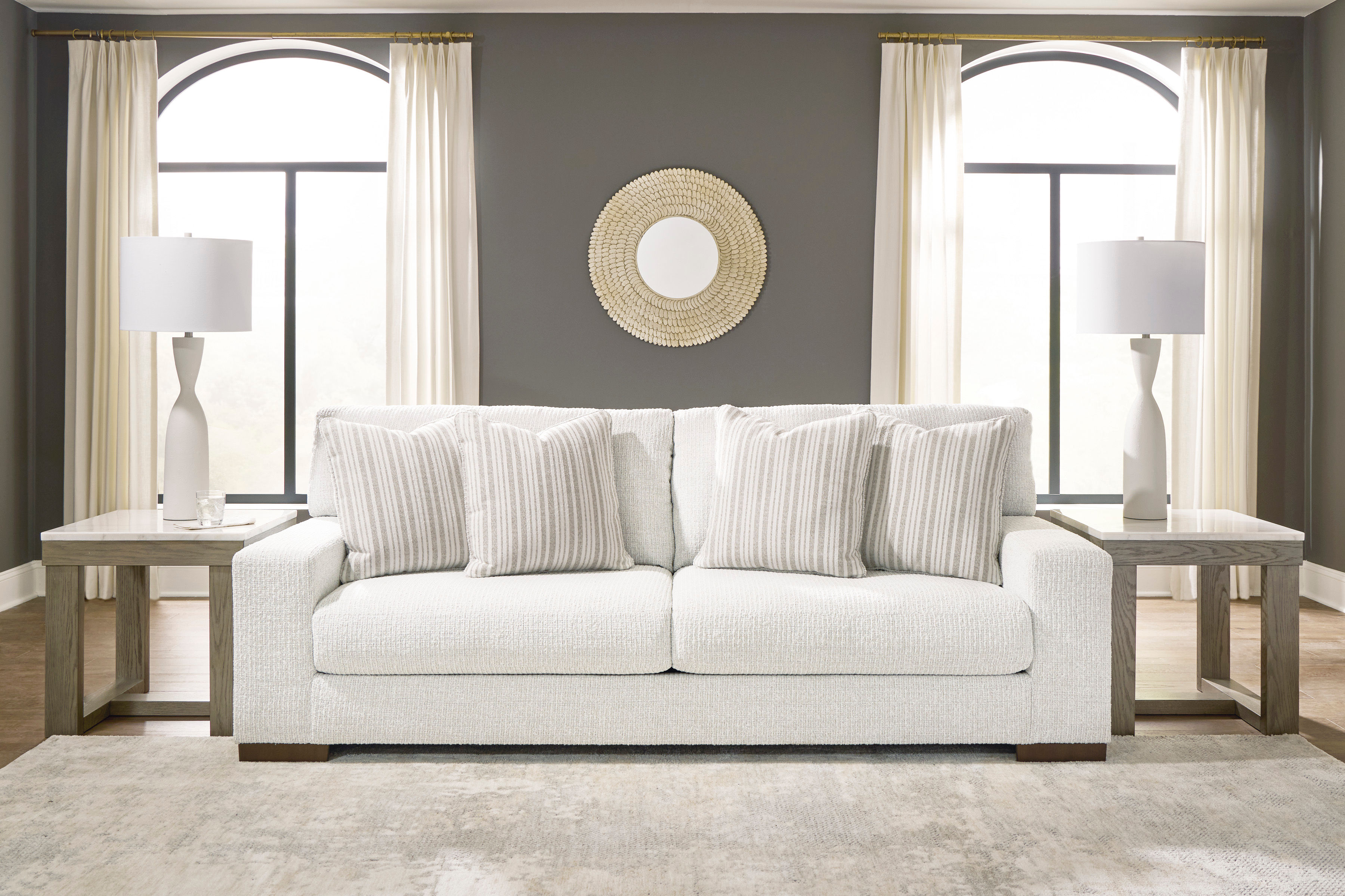 Wide track arms meets textured woven fabric upholstery with the Hartside sofa. The contemporary style and design will be sure to elevate your living room to the next level, while the Next-Gen Nuvella performance fabric upholstery is made to be durable and comfortable. The included accent pillows will create visual interest with the striped design.