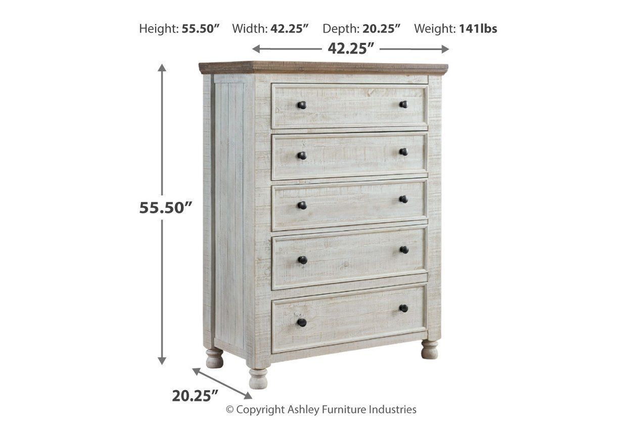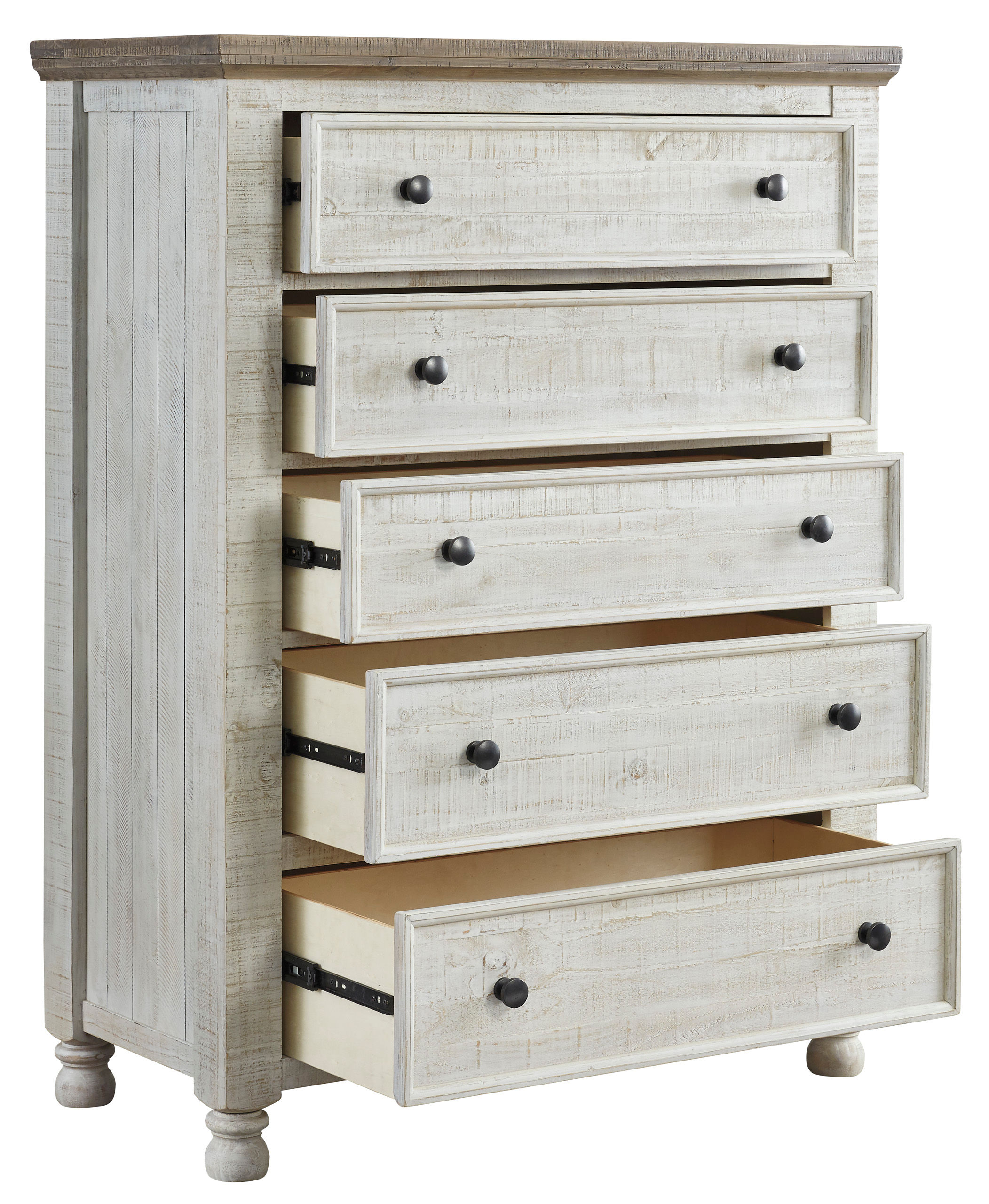 What a fresh interpretation of country classic style. Inspired by American farmhouse craftsmanship, but with an elevated sensibility, the Havalance chest of drawers blends distinctive details such as turned post accents and raised drawer fronts for substantial look that feels right at home. Those who appreciate rustic character should take note of this chest’s thick profile crown moulding, beautified with a vintage two-tone finish.