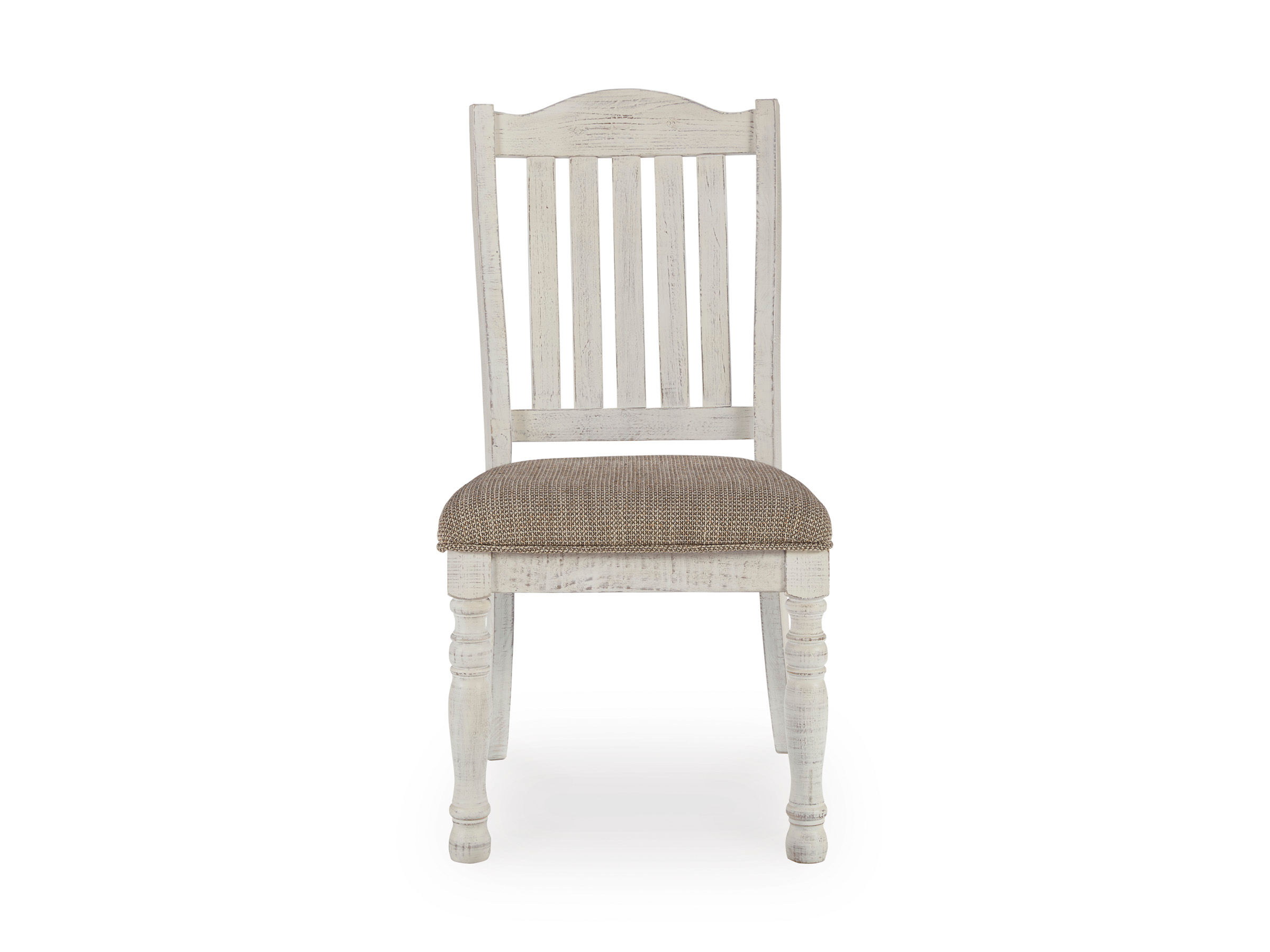 Have your fill of modern farmhouse style with the Havalance upholstered dining chair. Distressed vintage white finish is utterly charming. Bent slat back design and cushioned upholstered seat with woven oatmeal-tone fabric cater with beauty and comfort.
