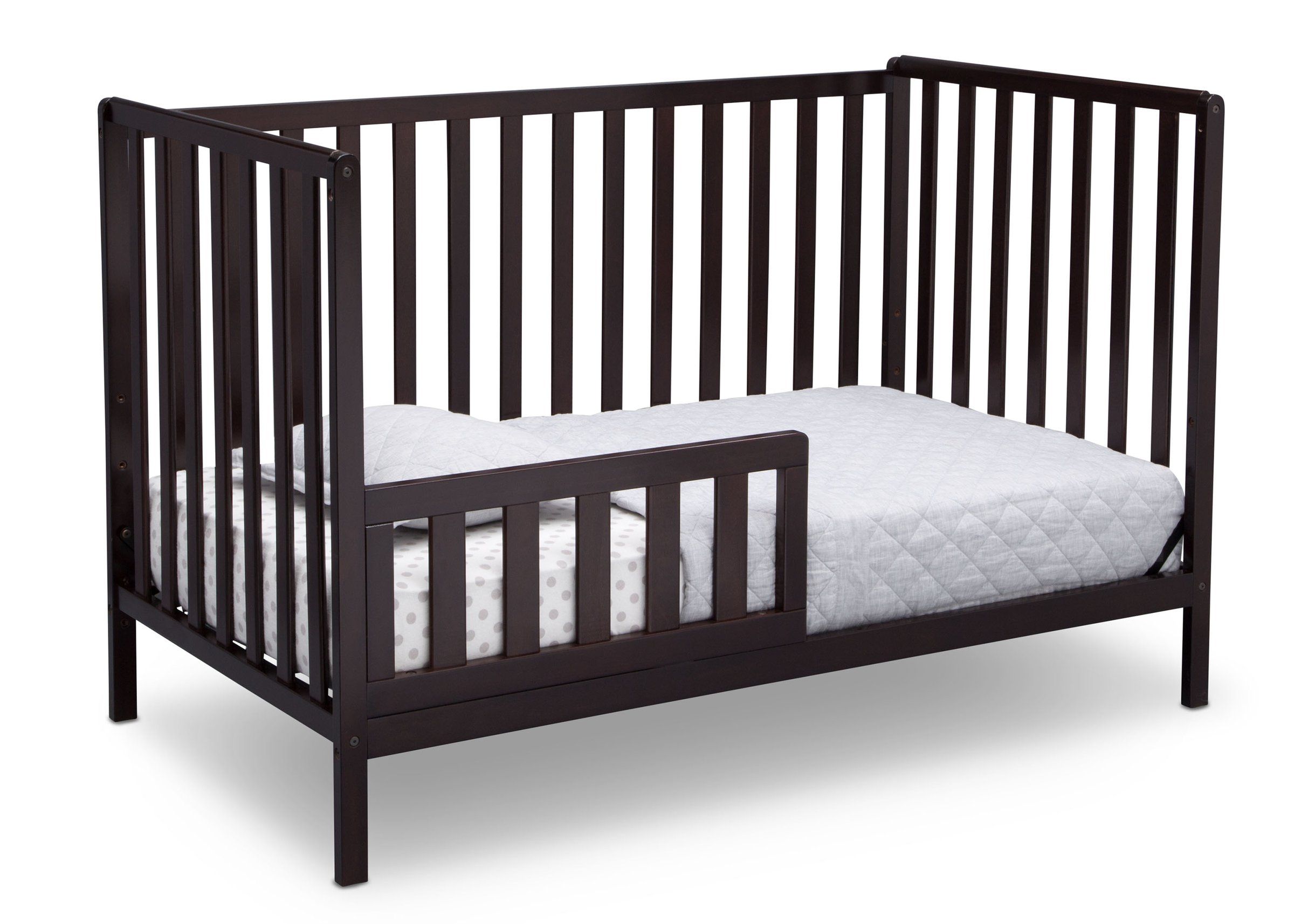 Simple and understated yet full of charm, the Heartland 4-in-1 Convertible Crib by Delta Children works in modern or traditional nurseries—so many possibilities with this versatile baby crib! Designed with clean lines and open and airy slats that provide a clear view to Baby, this crib is constructed from sturdy wood that stands up to years of use. A great value, the Heartland 4-in-1 Crib features three mattress height positions, so you can lower the mattress height as your baby grows, plus it converts from a crib to a toddler bed, daybed and full size bed (Daybed/Toddler Guardrail Kit and Full Size Metal Bed Frame sold separately). Providing a safe and secure place for your child to sleep from birth till adulthood, this crib proves it’s as functional as it is fashionable. Punched up with bold and playful hues that add a lively twist on the timeless silhouette, the Heartland 4-in-1 Crib from Delta Children makes it easy to create the nursery of your dreams. Available in multiple finishes.