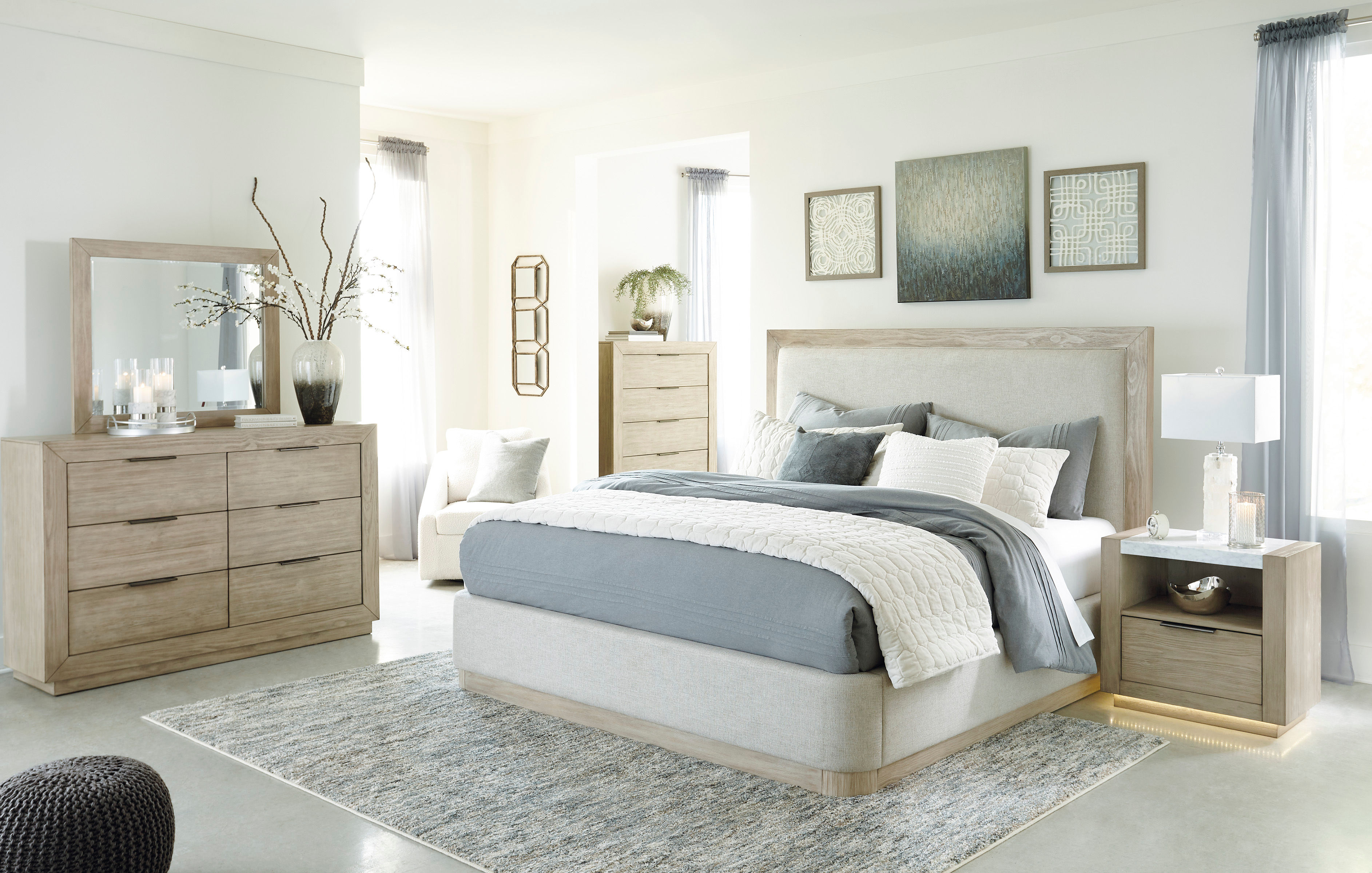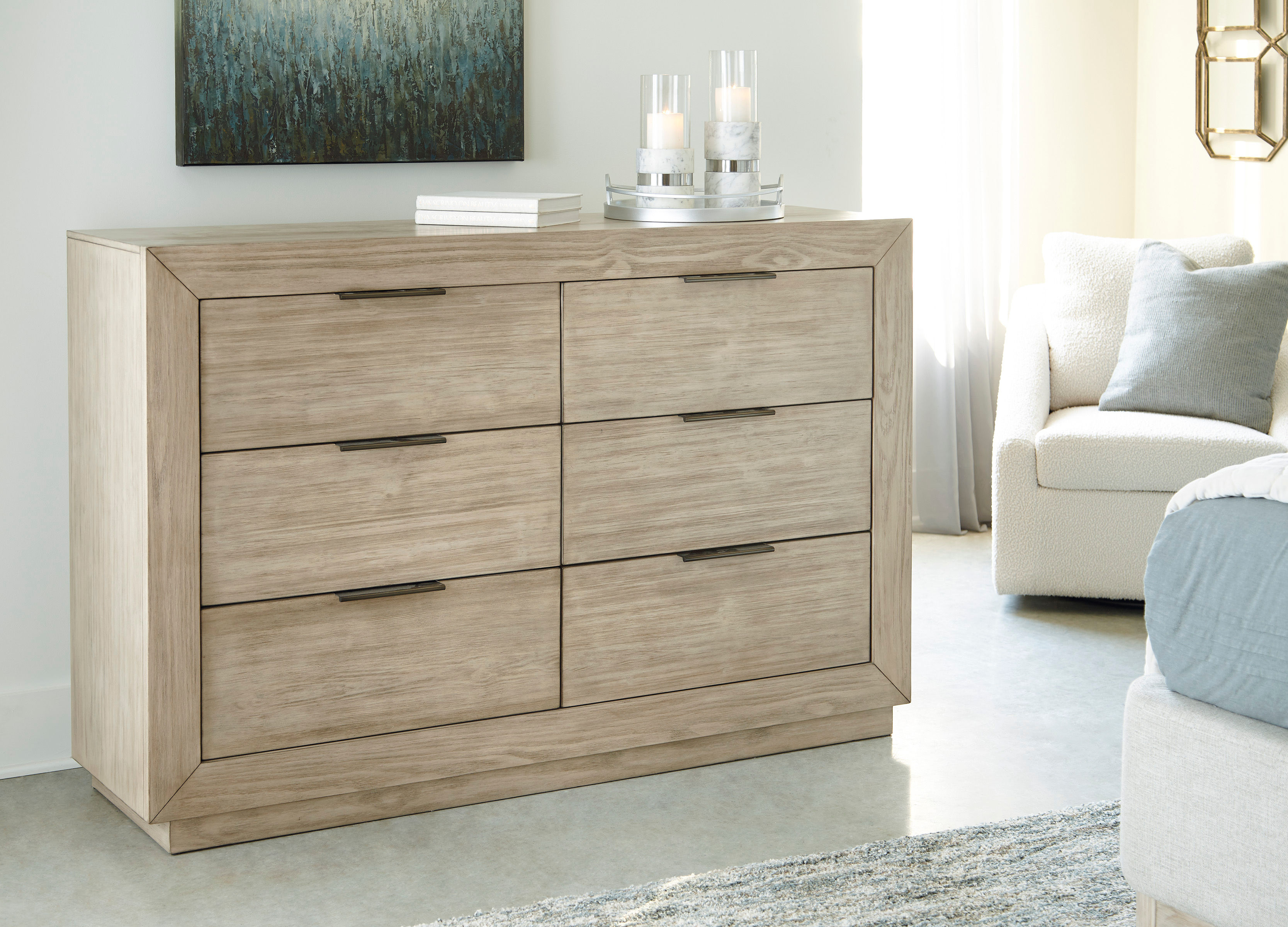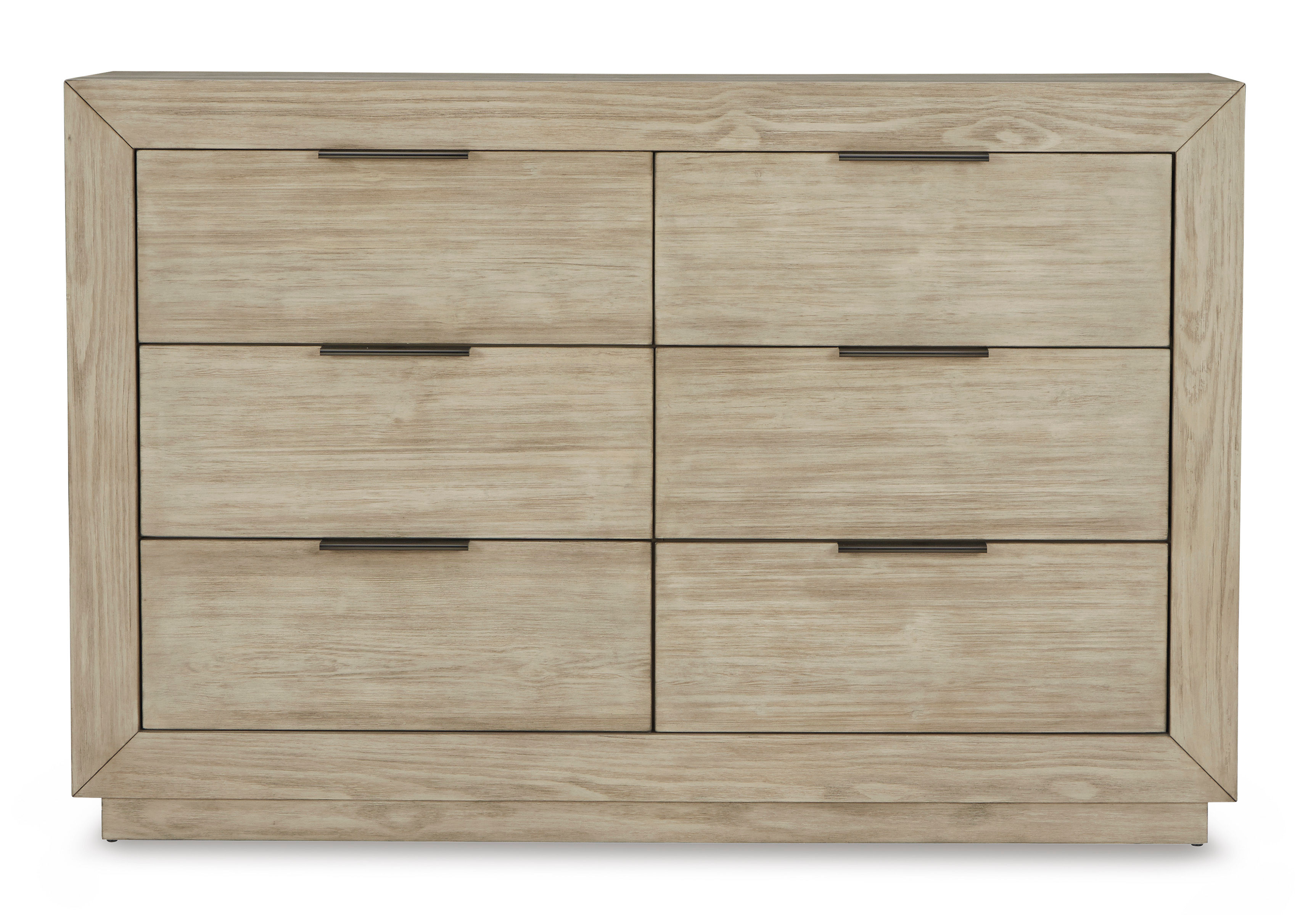 Get the luxe modern look you love at a price you can afford. The Hennington dresser features a structured silhouette on a plinth base that elevates the piece to a modern masterpiece. The six self-closing drawers have fully finished drawer boxes for a sleek look inside and out. Its textural surface has a complex bisque coloration for a refined, yet versatile, appeal. Slim nickel-tone bar pulls add a finishing touch to the clean-lined design.