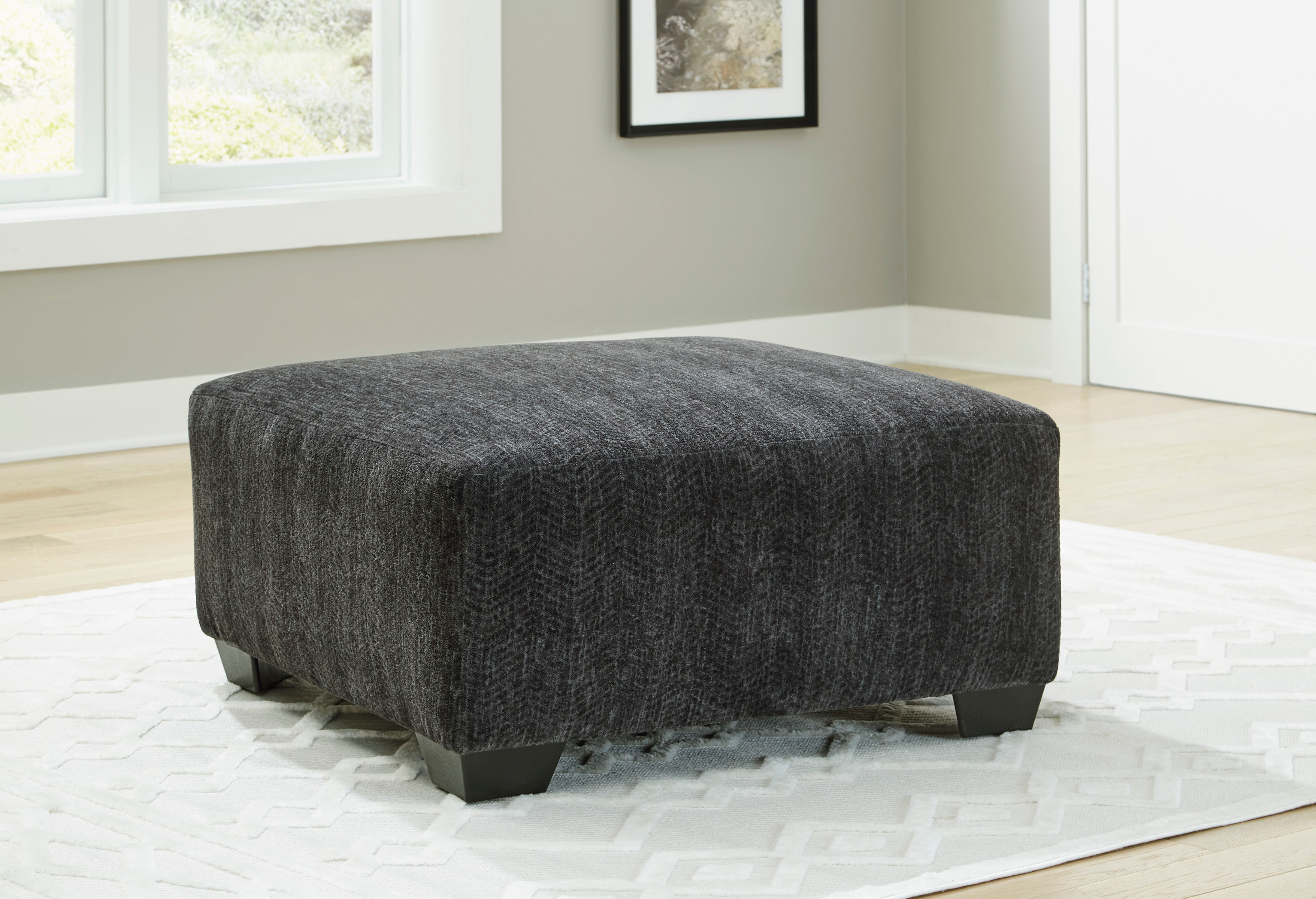 Embrace the contemporary style of the Hollyview oversized accent ottoman in your home. The shadow gray textured fabric upholstery adds visual interest and becomes the perfect contrast for light and bright interiors. Versatile in style and function, this oversized accent ottoman can become a coffee table with an added tray or a footrest that provides comfort.