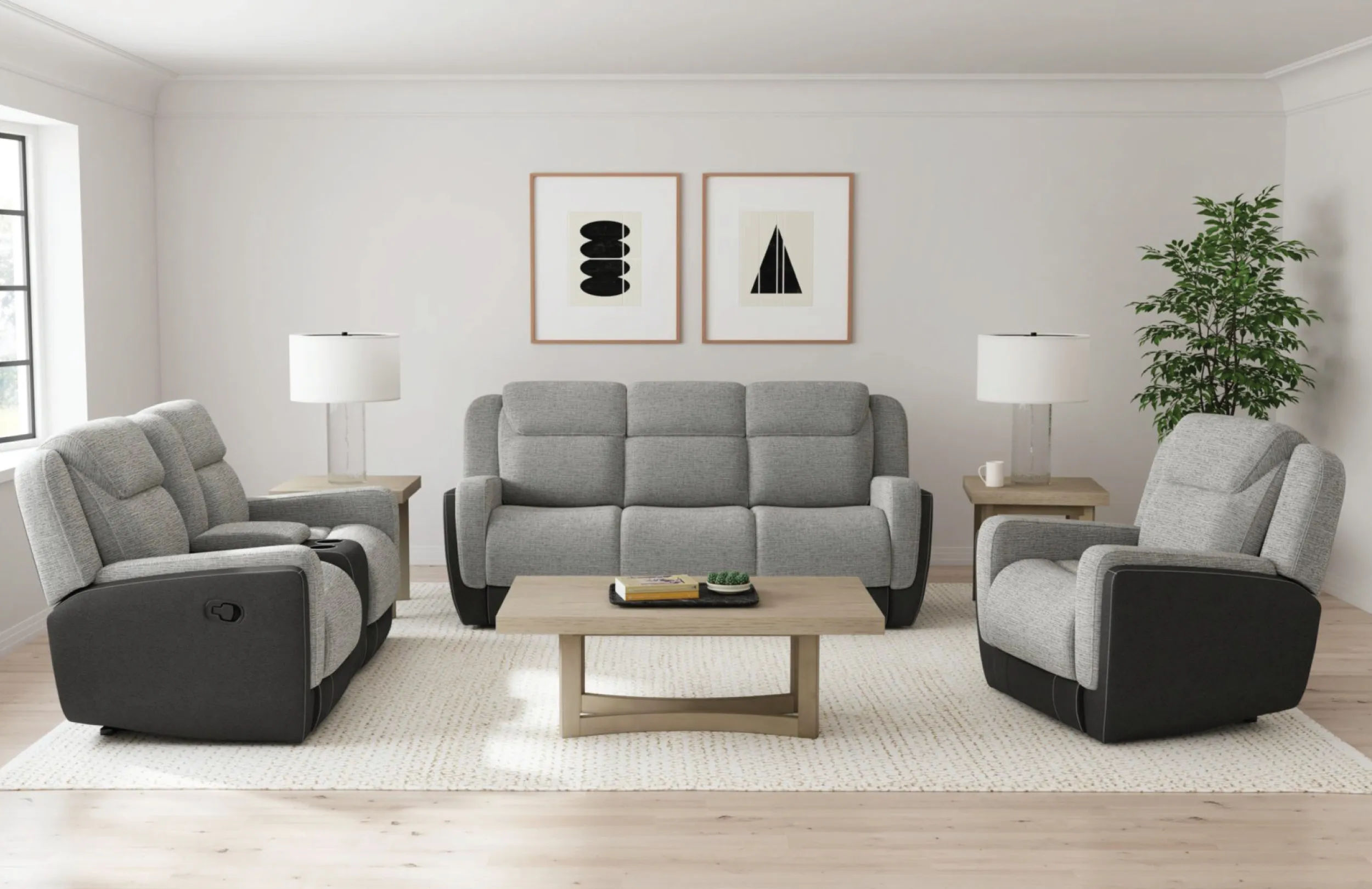 Add a perfectly neutral touch to your home with the Hornet glider recliner. Made with two-tone fabric upholstery, the light and dark gray color scheme works together to enhance your style. The contemporary design makes this the ultimate piece for any living space while the plush comfort of the seats, backrests, and armrests make it so you'll always stay relaxed. To enhance your relaxation even more you can use the easy-to-use pull-tab located on the side to kick your feet up.
