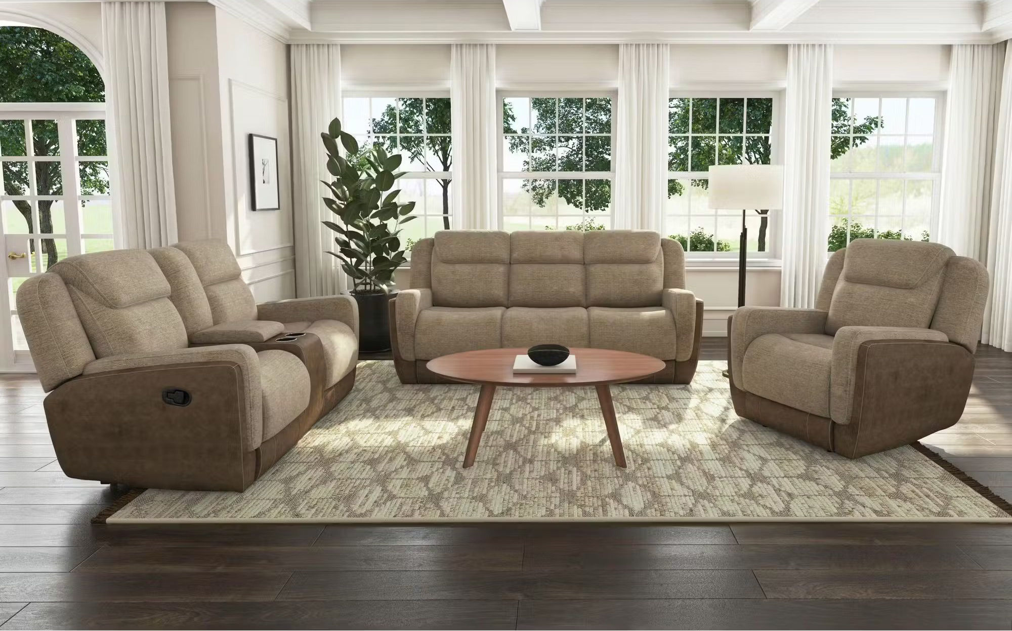 Indulge in the plush comfort of the light brown fabric upholstery and the contemporary style of this Hornet manual reclining loveseat. The brown leather upholstery around the bottom, sides and back of the Hornet reclining loveseat adds visual interest. This piece also has a middle storage console and 2 cupholders so you'll have everything you need for binging your favorite shows within arms reach.