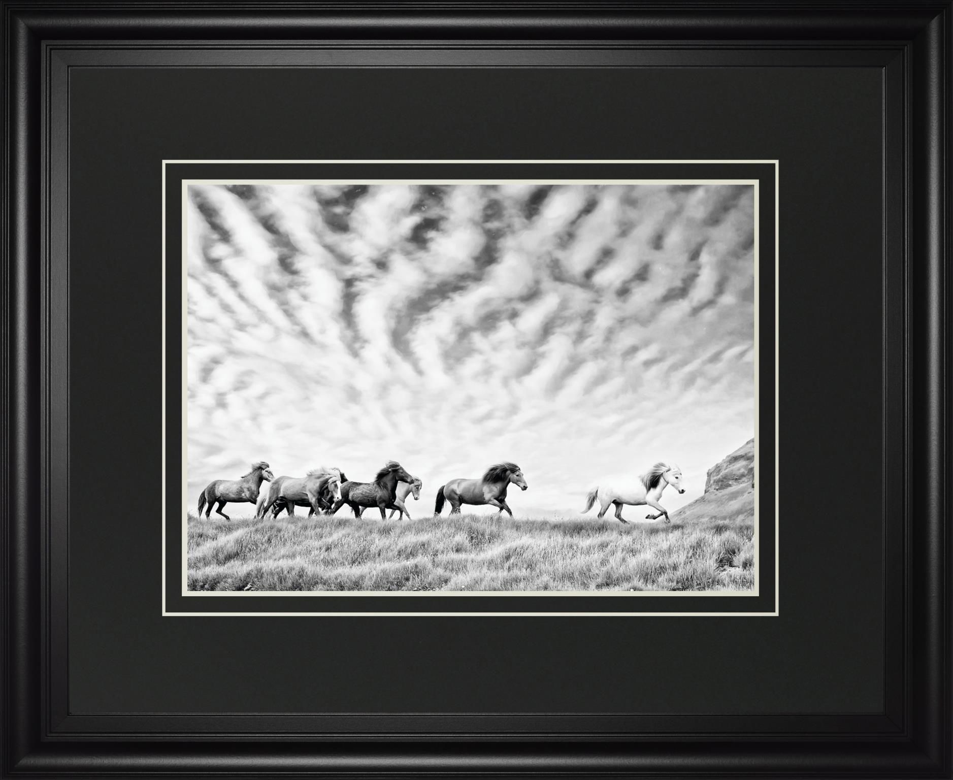With the grayscale color scheme and the contemporary style of the "Horse Run III" wall art, you'll be able to get rid of that empty space on your wall with ease. This piece of wall art features a row of many different horses running in the fields.