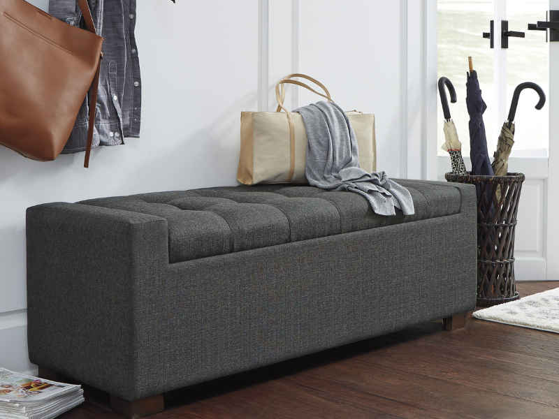 If you have the space, an entryway bench or stool provides a much-appreciated place to sit and put on or remove shoes. Many entryway benches have built-in storage compartments, shelves or cubbies, so you get plenty of functional use for the footprint.
