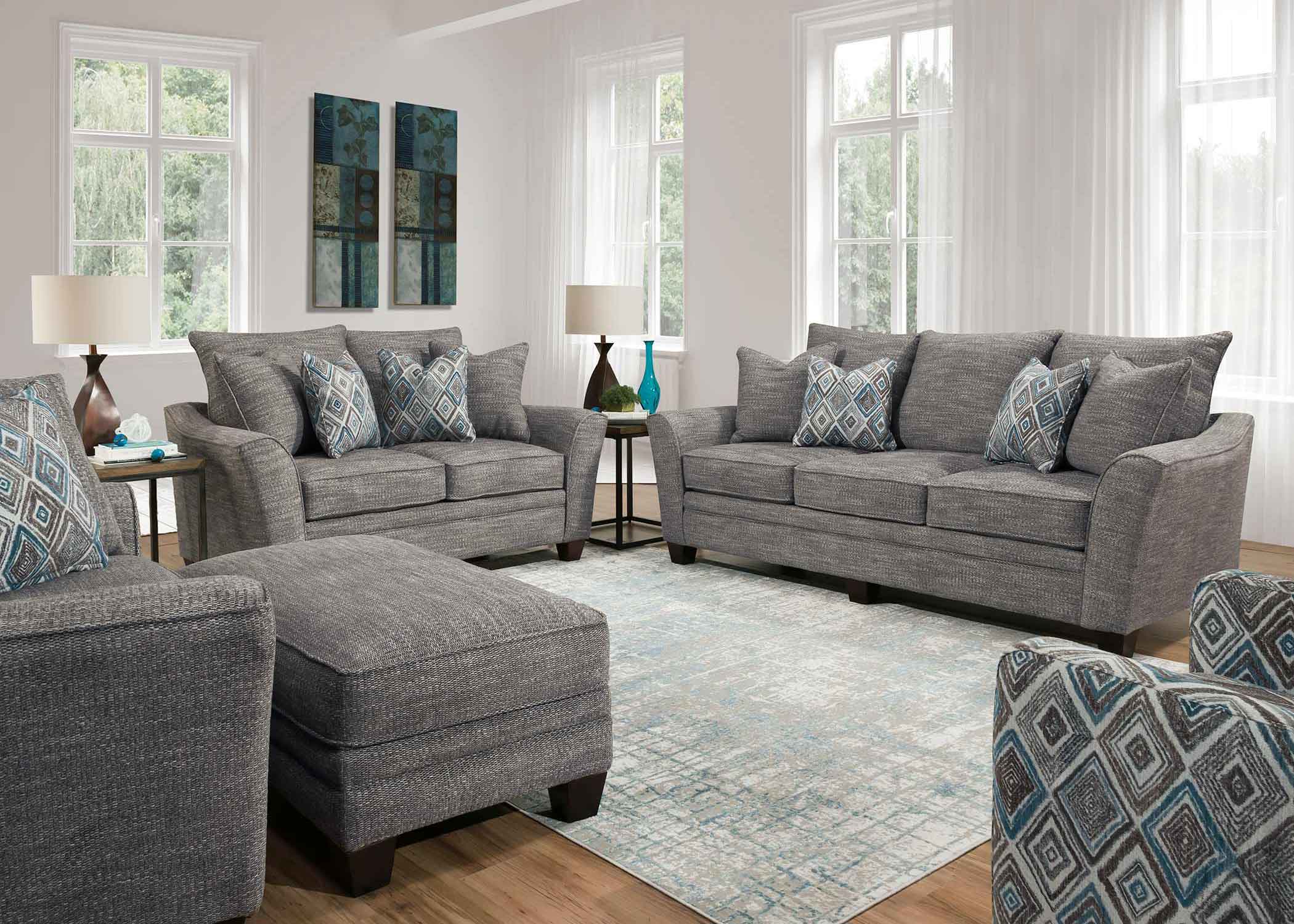 The Hughes stationary sofa group is upholstered in a polyester blend that creates a soft yet durable fabric with accent pillows. This collection features reversible seat and back cushions for increased comfort and durability.