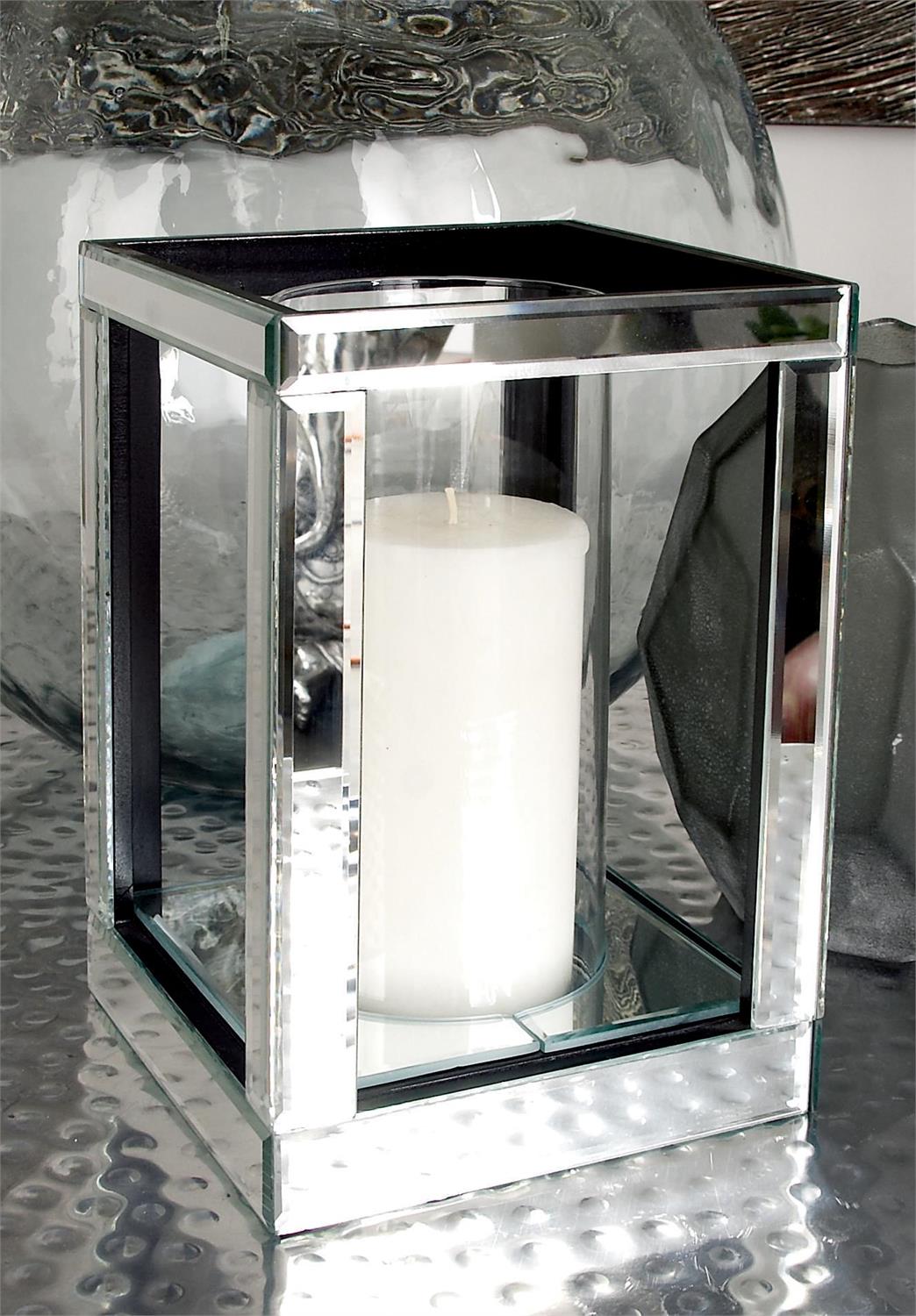 • Candle holder is crafted of mounted wood frame with reflective glass mirror exterior and interior