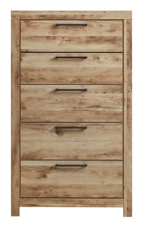 Inspired by natural beauty, refined to perfection. The Hyanna chest of drawers brings cozy outdoor vibes to your bedroom with its warm and inviting golden rustic finish. Handles in an antiqued gunmetal hue adorn the five drawers on its framed front, adding an industrial touch to the simple, streamlined design.