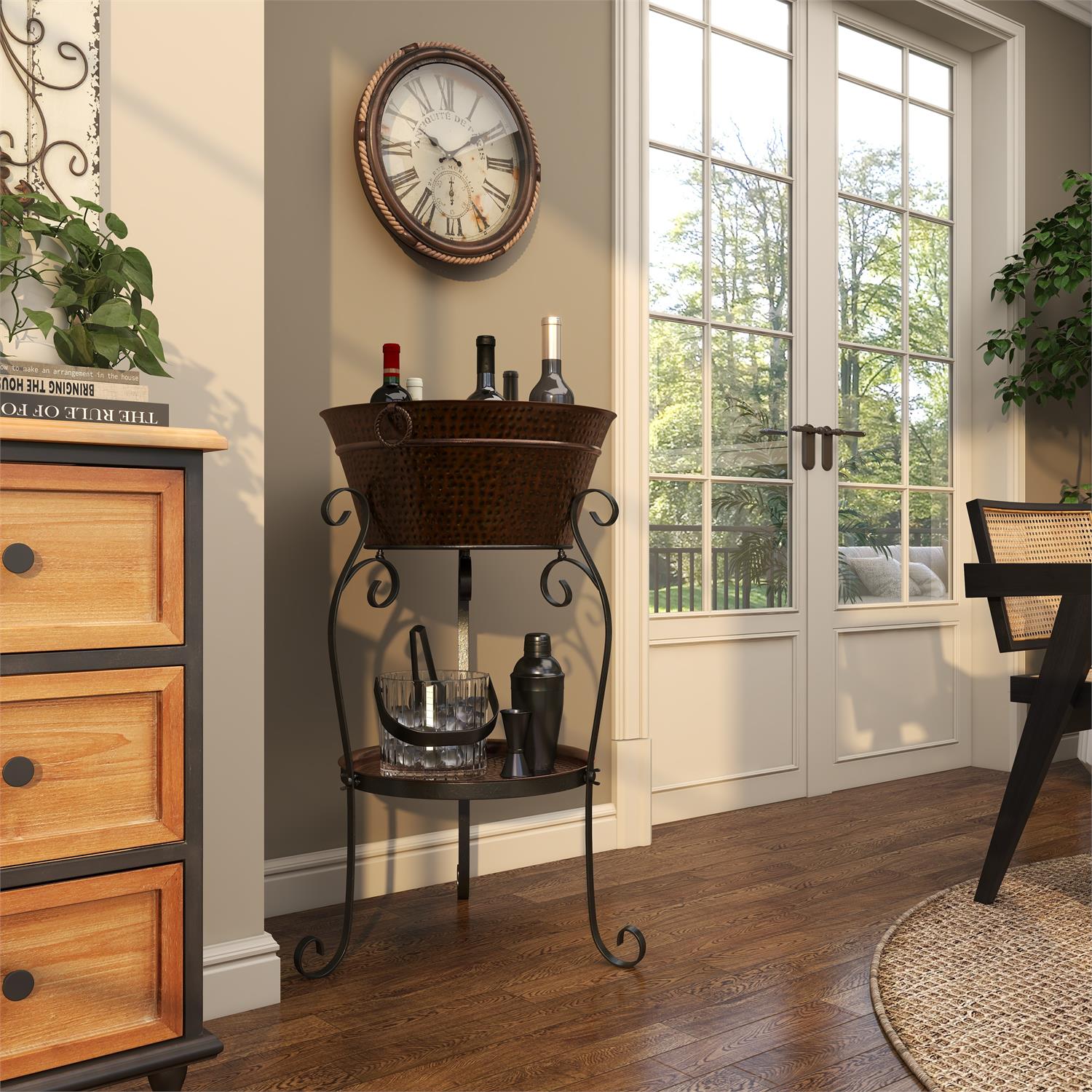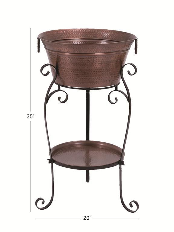 Designed with rugged beauty and an earthy charm, where natural simplicity, warmth, and organic materials create a wholesome atmosphere. This hammered bucket cooler on stand is crafted with solid metal material. Features a polished copper finish on the metal material. Features an extra large bucket for better ice and bottle accommodation.