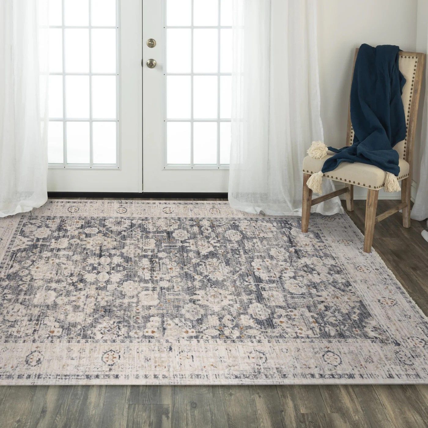 The traditional style and design of the Iconic rug collection from Rizzy Home has a cool color palette with shades of blue and ivory. This collection is easy to clean and soft to the touch.
