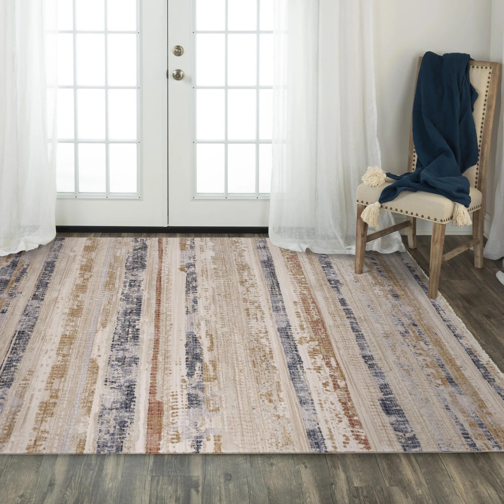 The contemporary style and design of the Iconic rug collection from Rizzy Home has a cool color palette with shades of brown and terracotta-blue. This collection is easy to clean and soft to the touch.