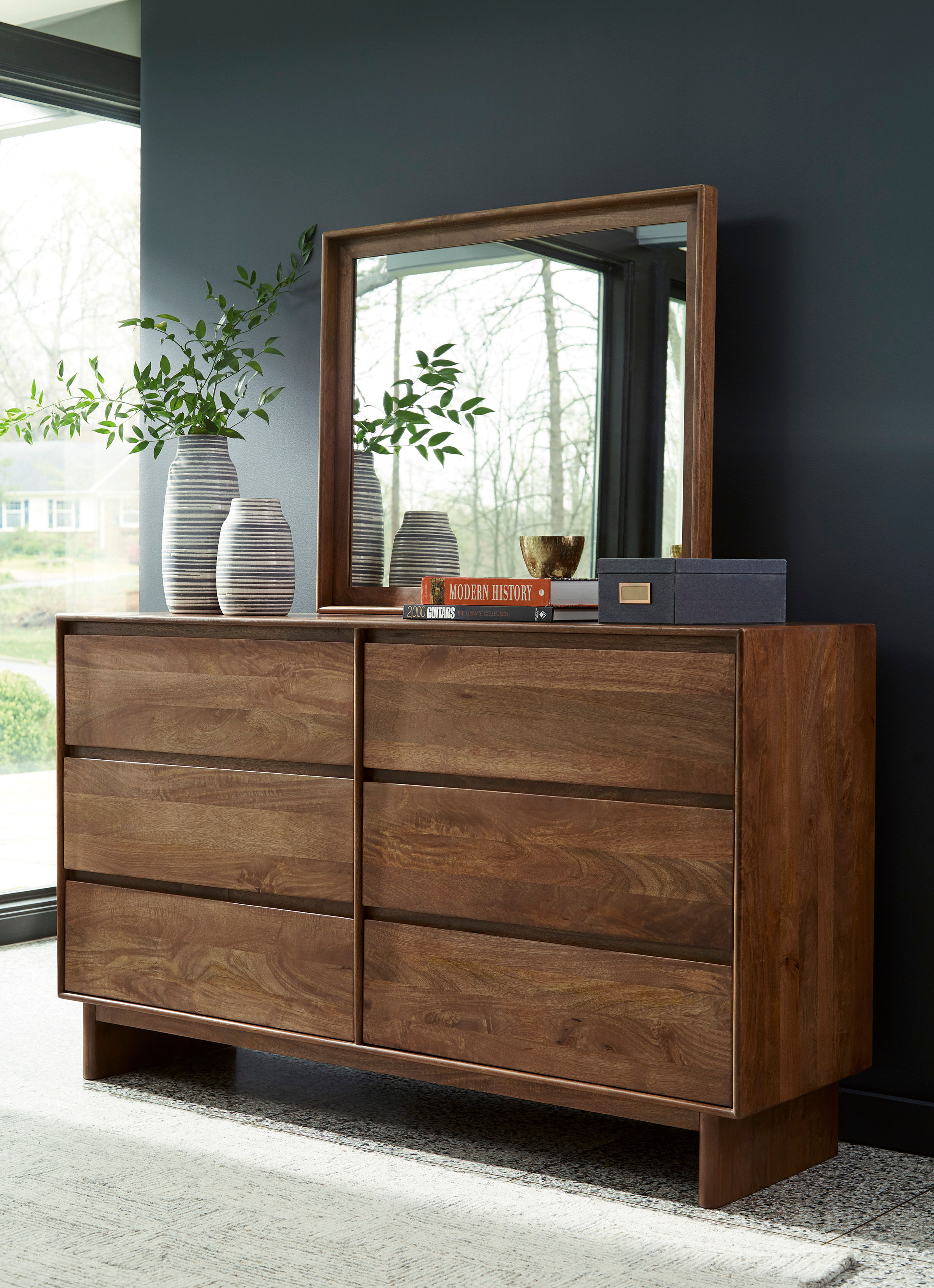 With its back-to-nature sensibility, this dresser with mirror set is a natural fit for outfitting your peaceful sanctuary. Clean-lined design lets the beautifully organic quality and inherent luster of the mango wood shine through. From its smooth "hardware-less" drawer to the refreshing light finish, it’s a set sure to make a statement in your naturally beautiful home.