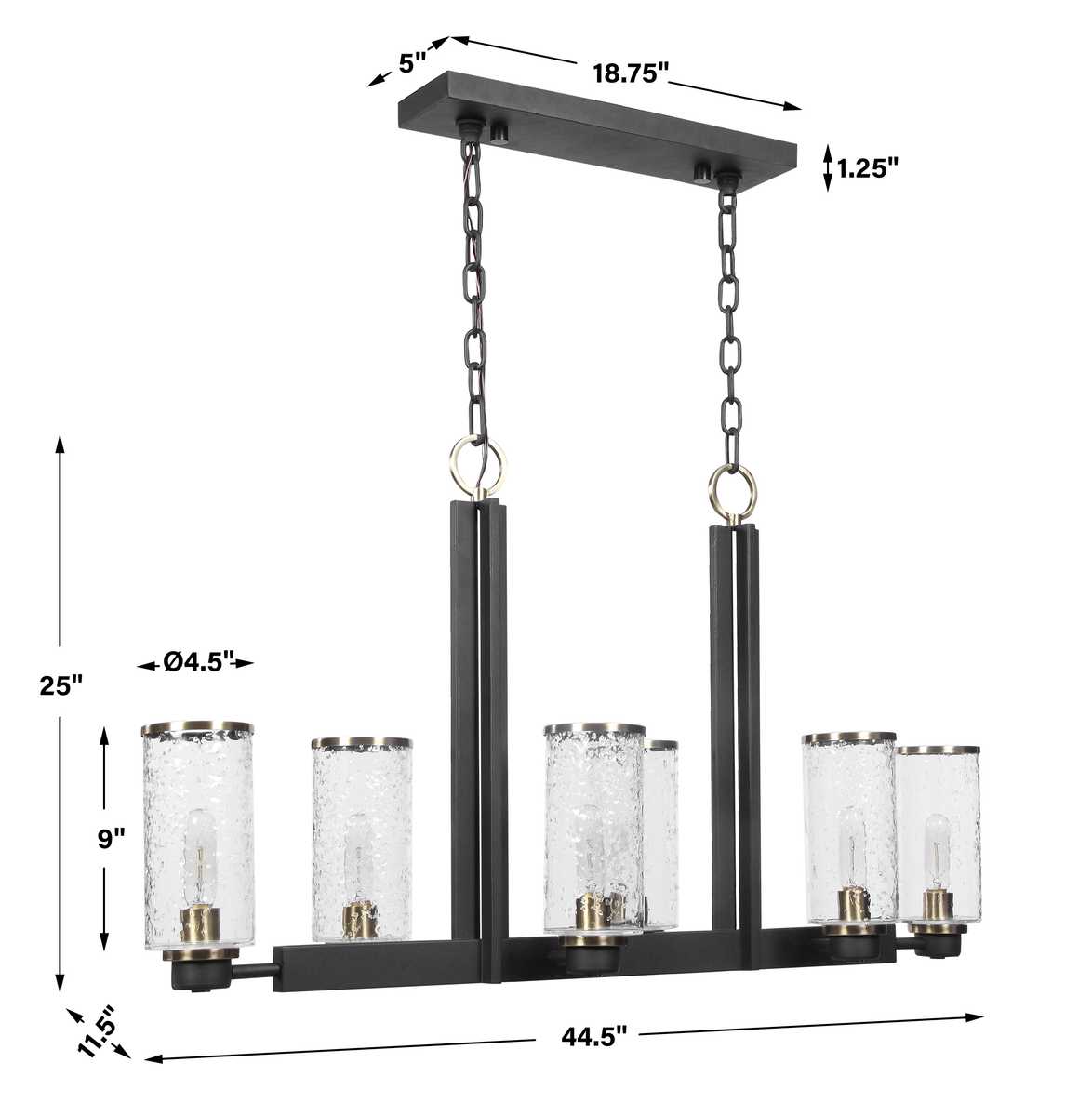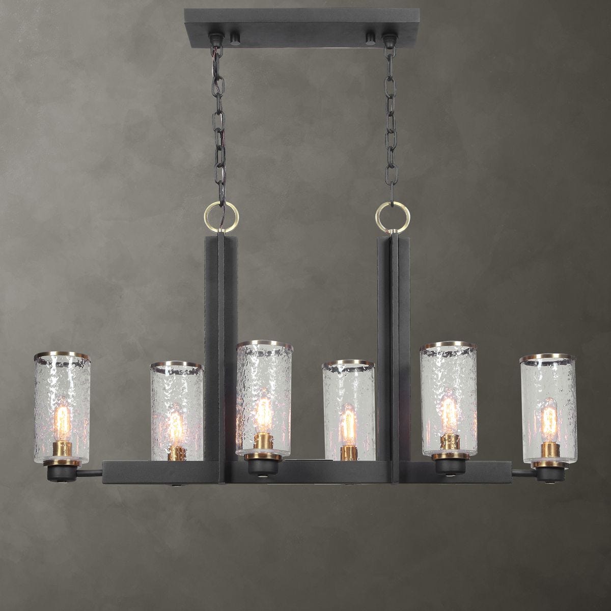 Refined industrial with clean lines on our 6 Lt. island features a sanded black finish on the I-beam style frame with refined antique brass accents and clear meteor shower glass shades. 6-60 watt max Edison sockets. Bulbs not included. Supplied with 20' wire and 7' chain for adjustable installation.