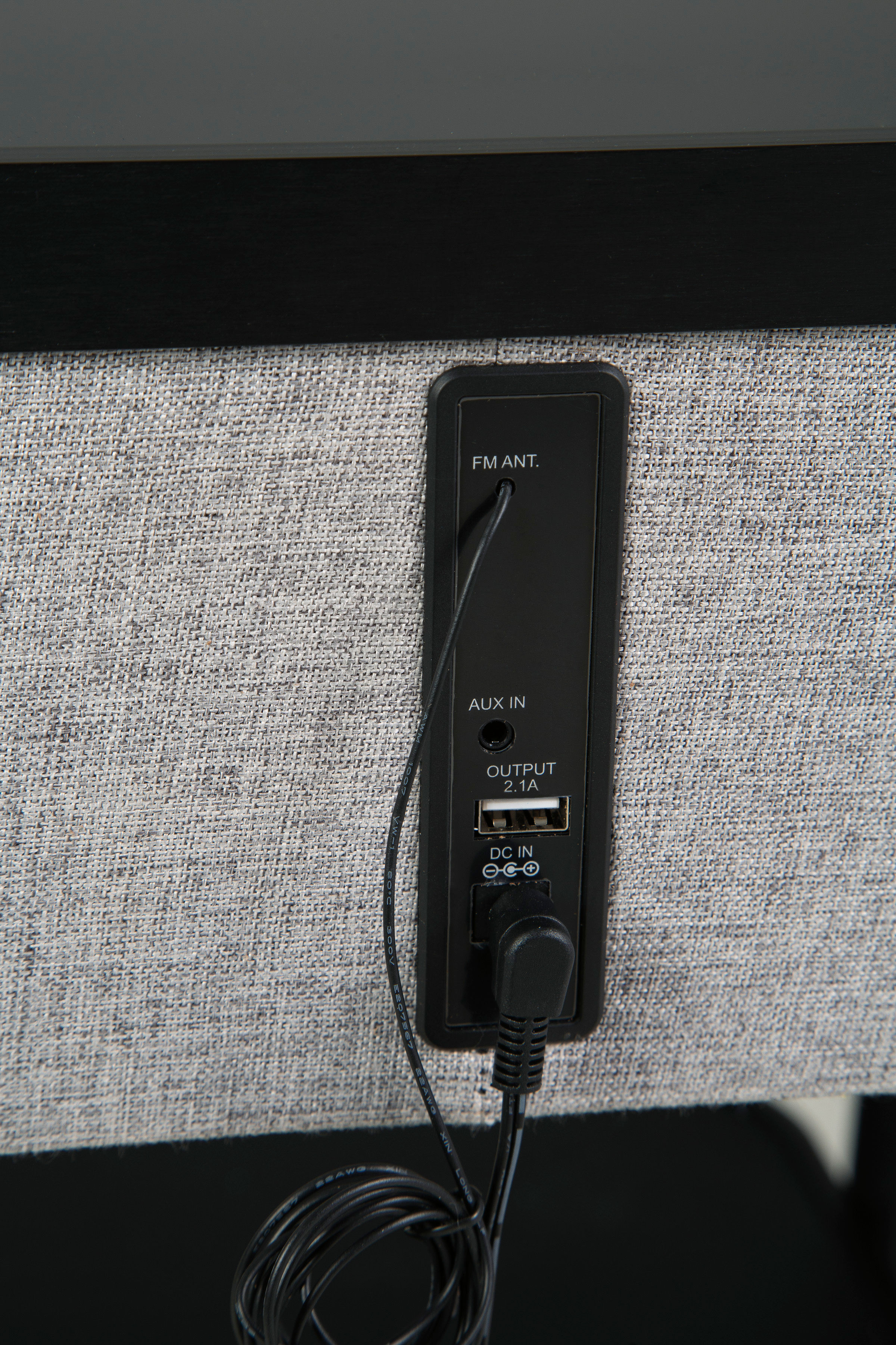 • Wireless connection; FM antenna; aux input; USB charging port